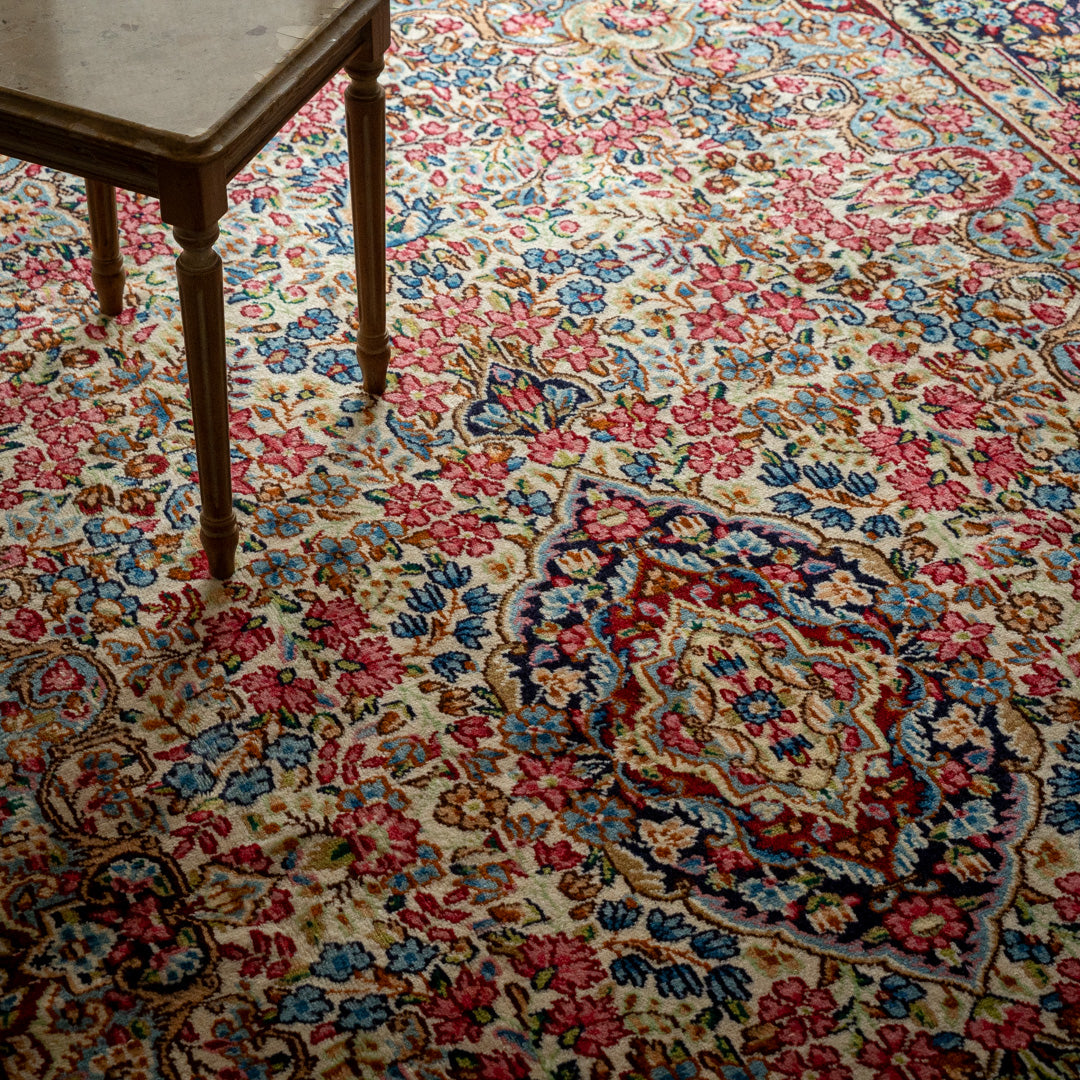 ケルマンはイランの南東に位置する都市です。この地域で生産される絨毯は、カラフルで花模様のデザインが特徴です。絨毯のパイルにはハイクオリティーのウールが使用され、中にはシルクを使用したものもあります。そのため、華やかで美しい絨毯が生み出されます。
