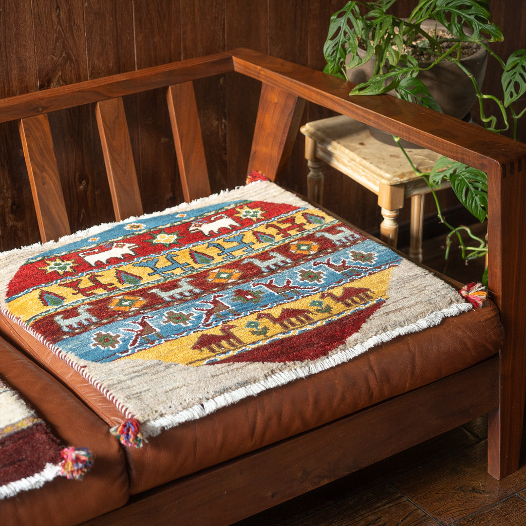 ギャッベはイランのザクロス山脈を遊牧しているカシュガイ族が手織りする、草木染の羊毛を使った毛足の長い生活に根付いた絨毯です。本商品に使用されているペルシャバリアントと呼ばれる羊毛は、過酷な環境であるザクロス山脈で生きていく為の優れた耐久性や、体温調整を上手に行うために多くの脂分を含んだ柔らかく触り心地の良い毛質を揃えています。