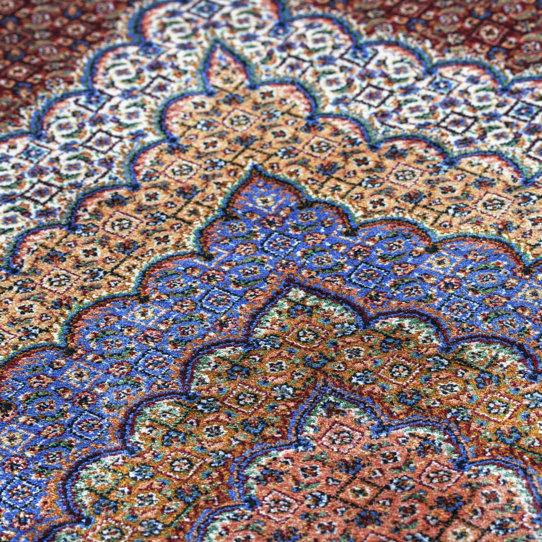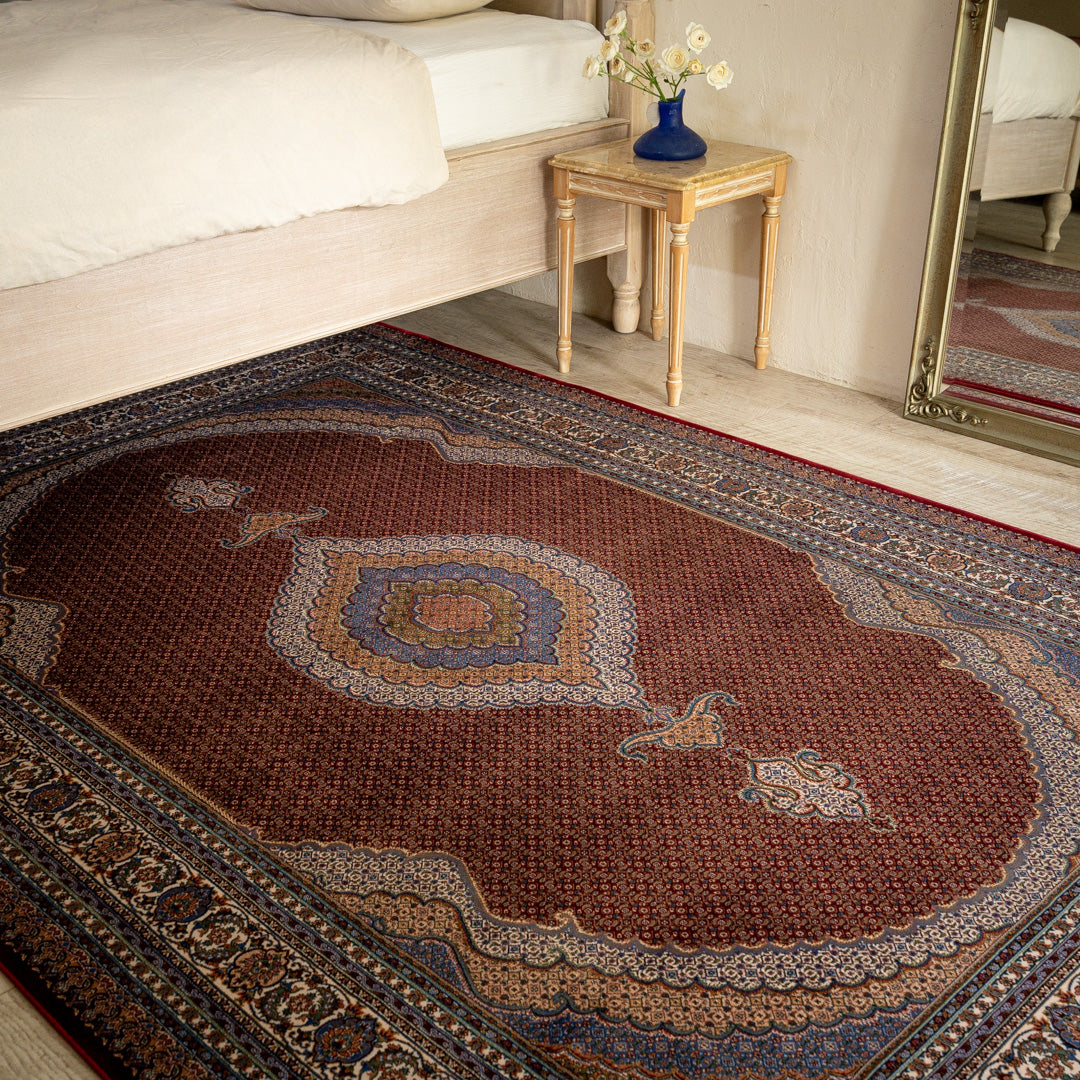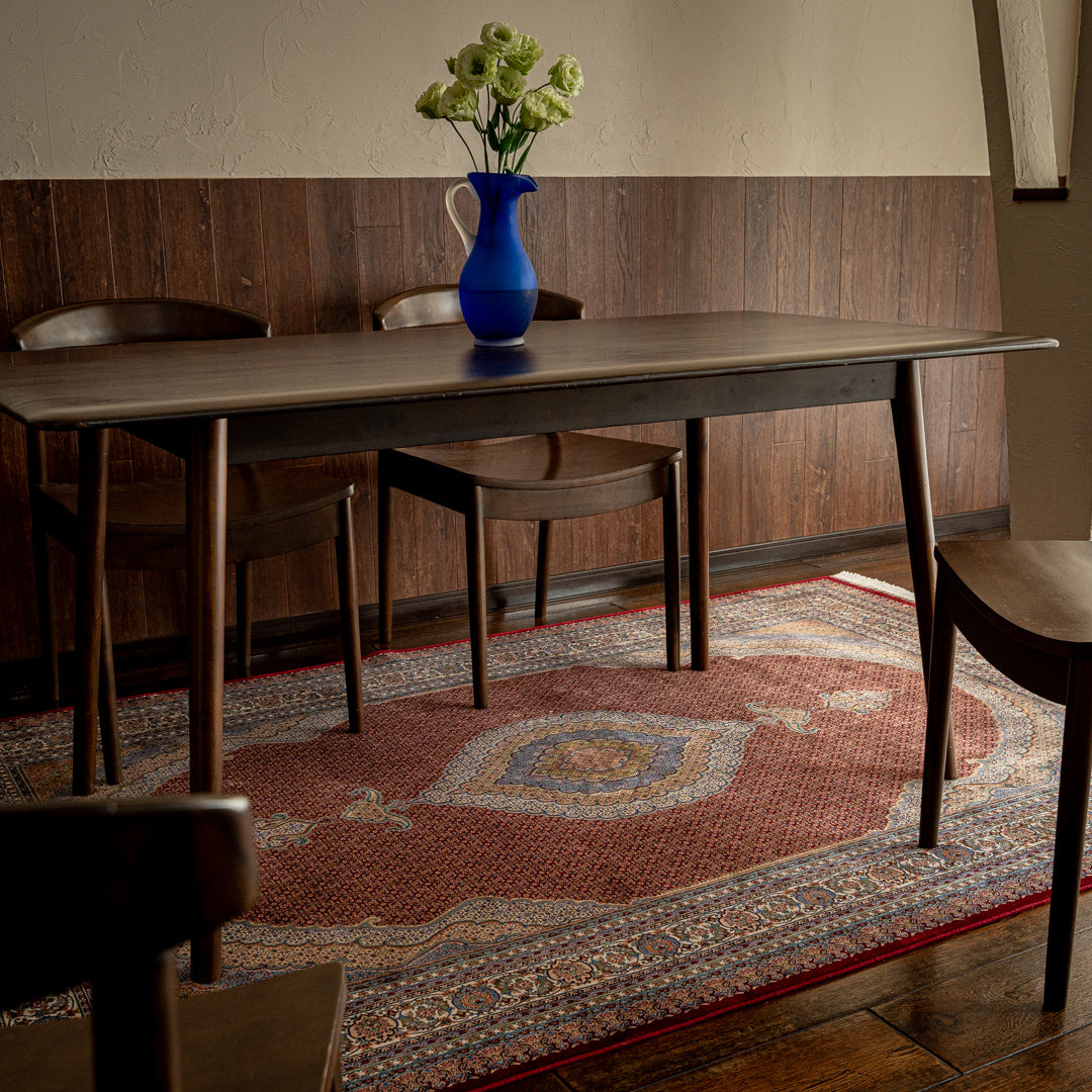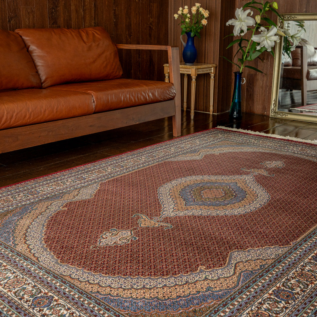 本場ペルシャ絨毯の産地イラン(ペルシャ)のデザイナーが柄を考案したこのシリーズは、ペルシャ絨毯らしい高級感はそのままに、手織りに近い技術を持つ機械で織ることによって、コストを抑えています。