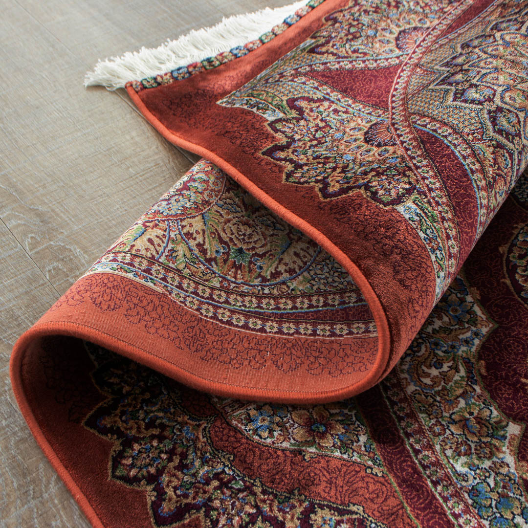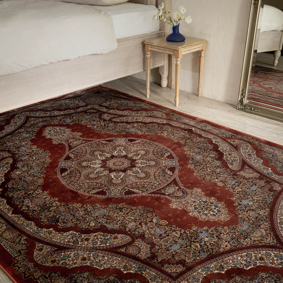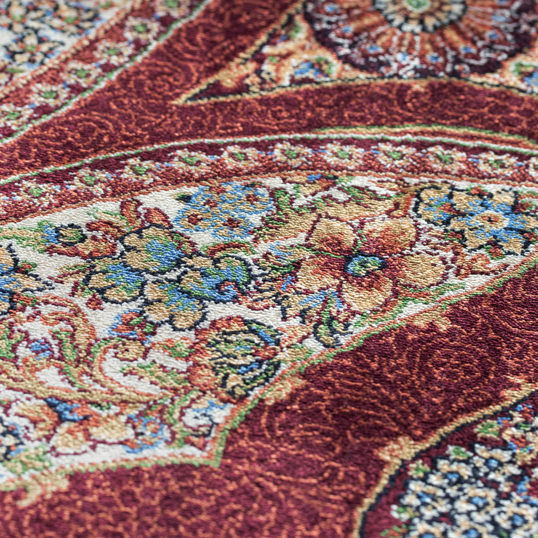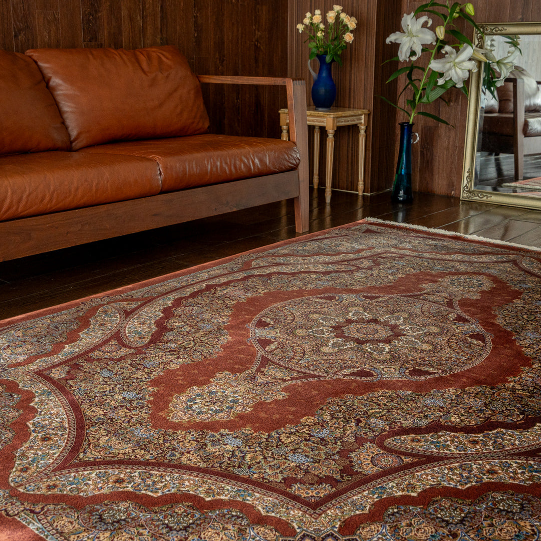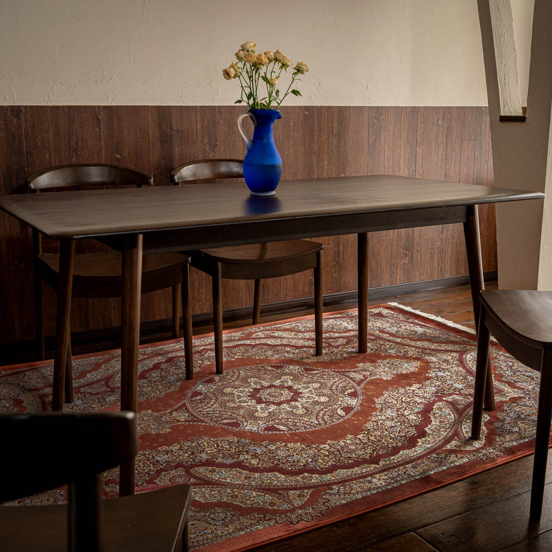 本場ペルシャ絨毯の産地イラン(ペルシャ)のデザイナーが柄を考案したこのシリーズは、ペルシャ絨毯らしい高級感はそのままに、手織りに近い技術を持つ機械で織ることによって、コストを抑えています。