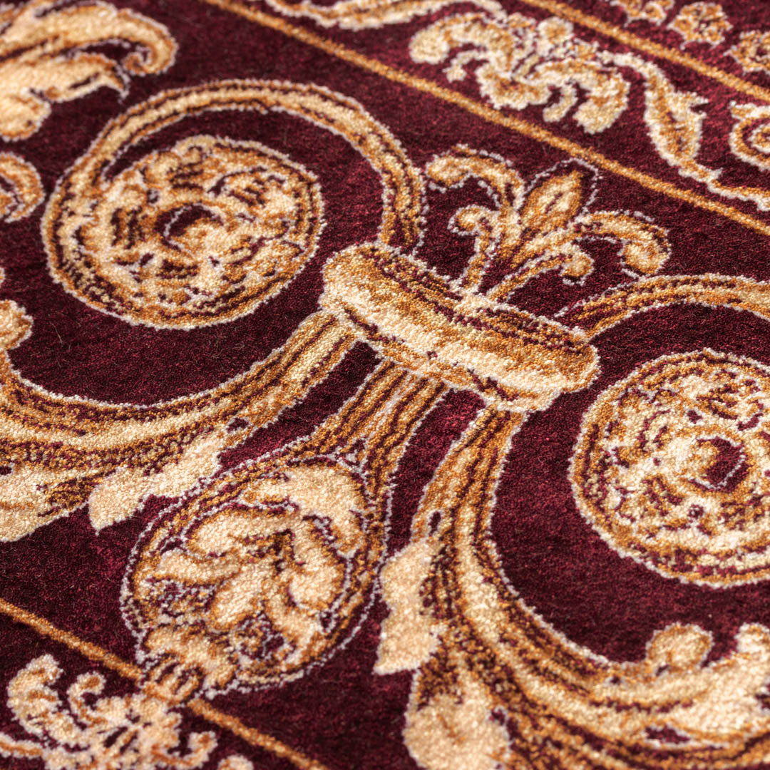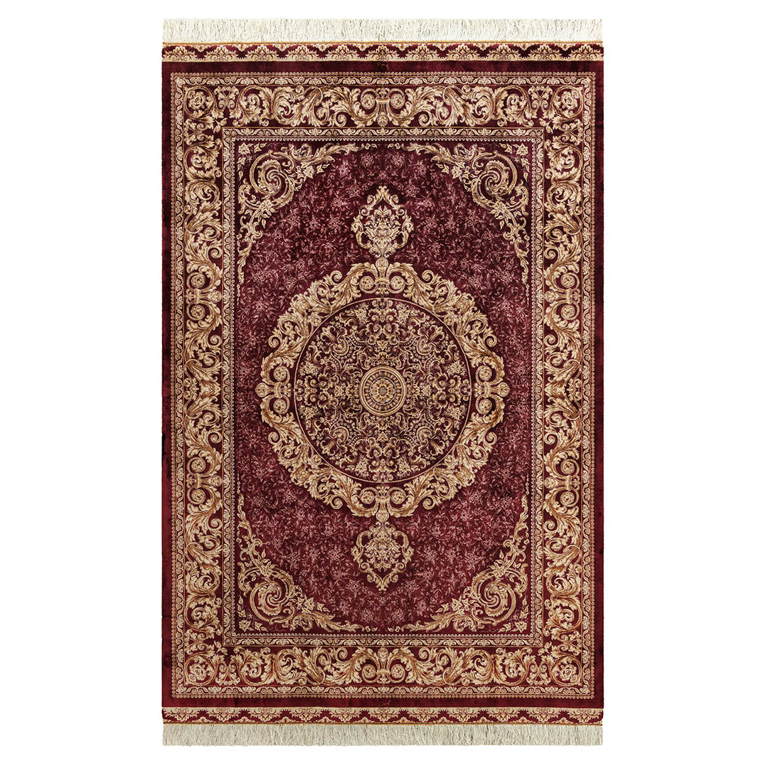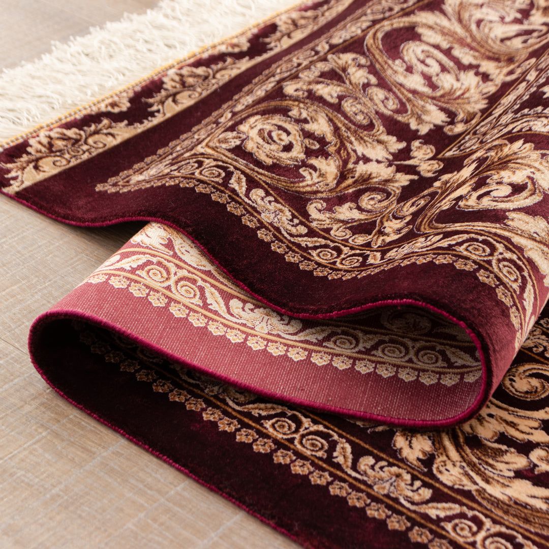 この絨毯は機械と手作業の両方で織られた織り目の細かい絨毯です。周りのフレームやフリンジの部分が手作業で織られ、より高級感のある丁寧な仕上がりが特徴です。
