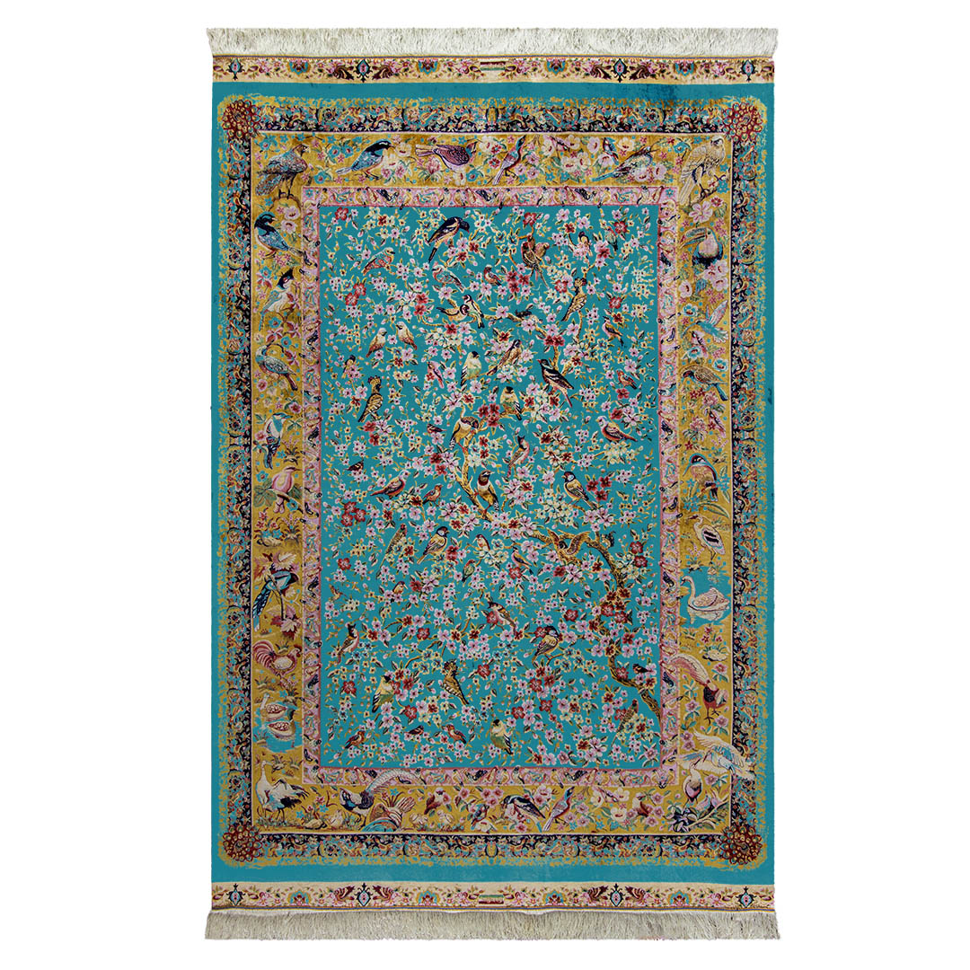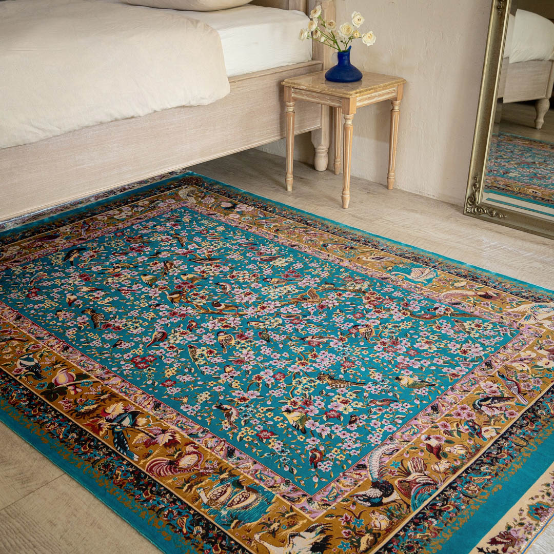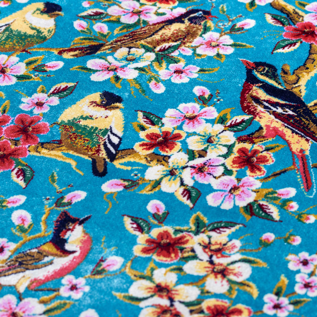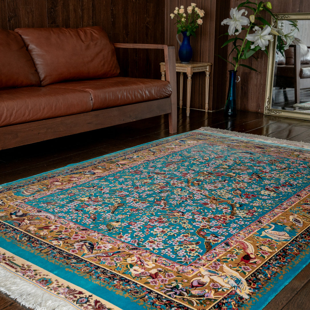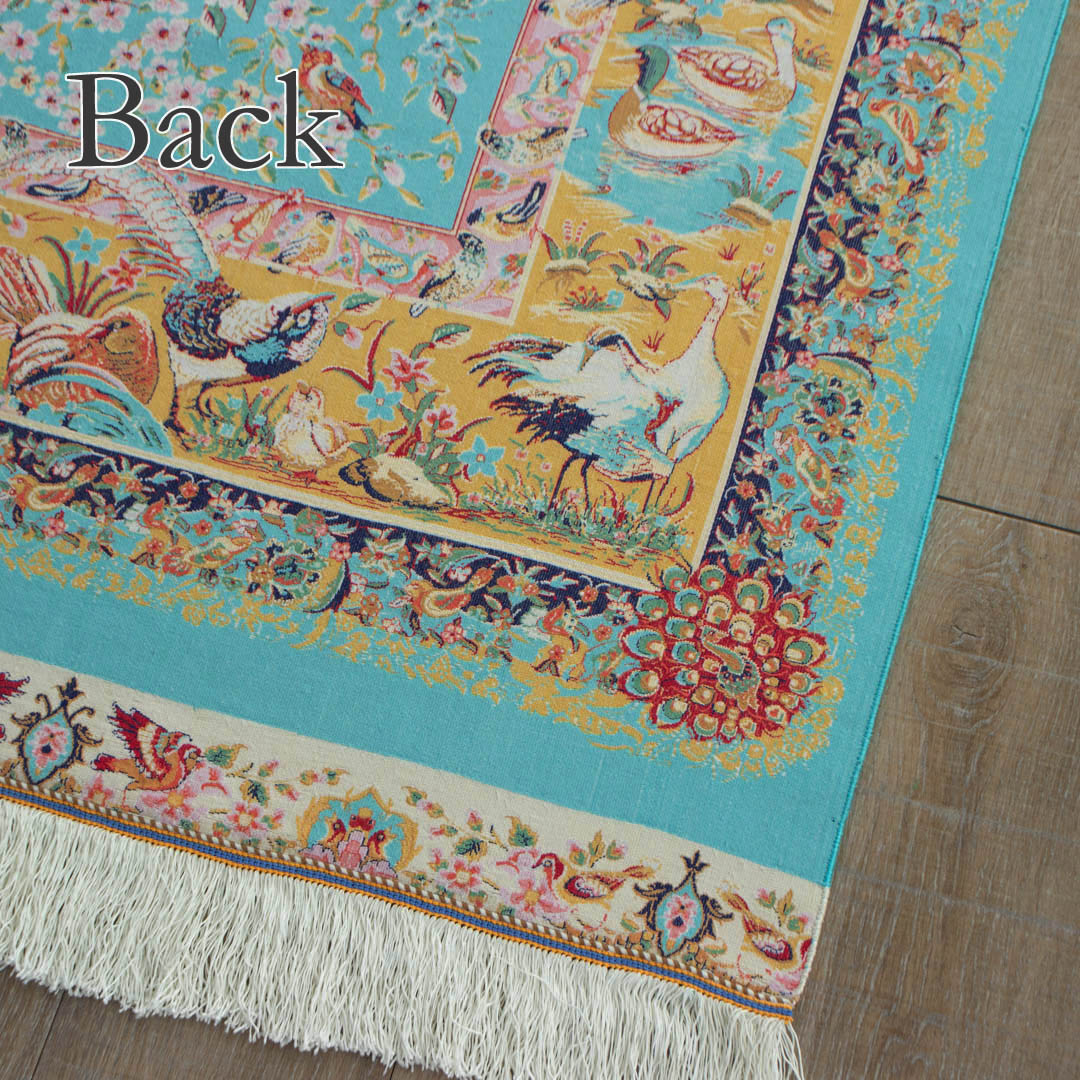 この絨毯は機械と手作業の両方で織られた織り目の細かい絨毯です。周りのフレームやフリンジの部分が手作業で織られ、より高級感のある丁寧な仕上がりが特徴です。