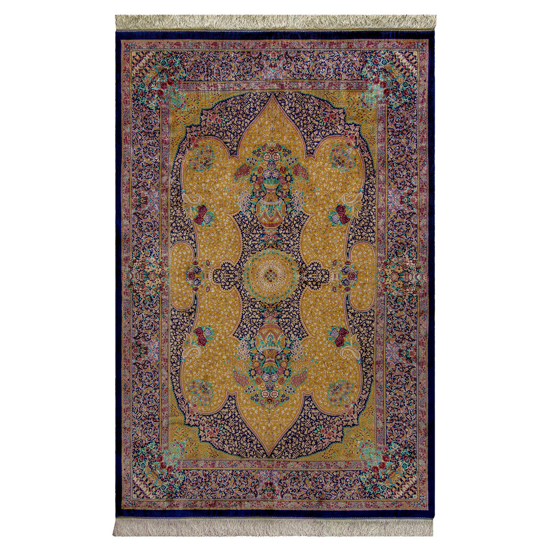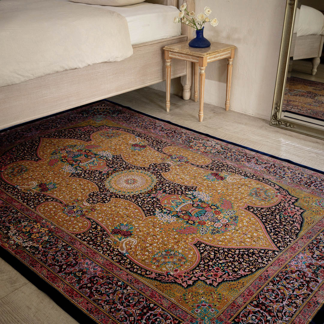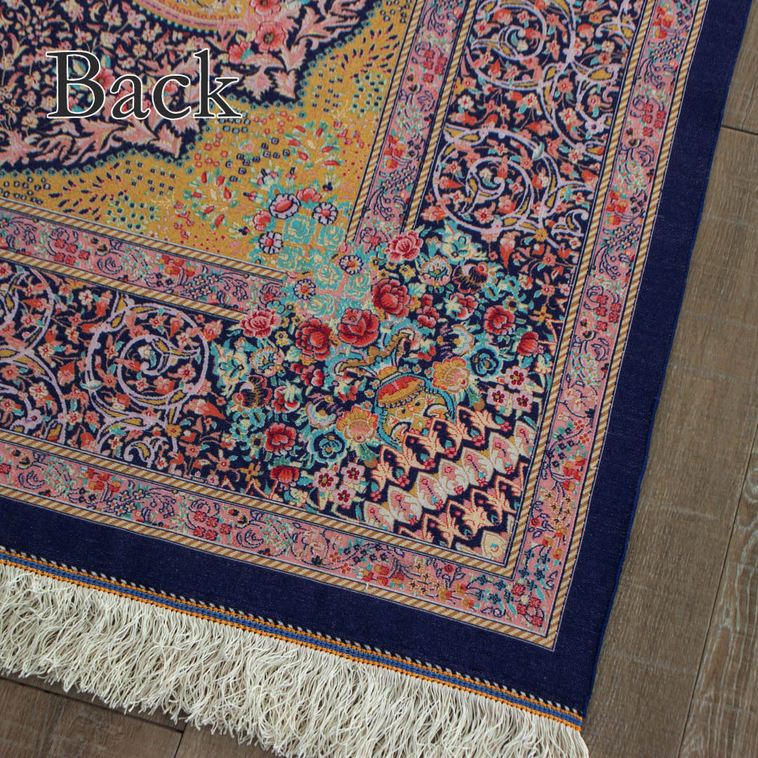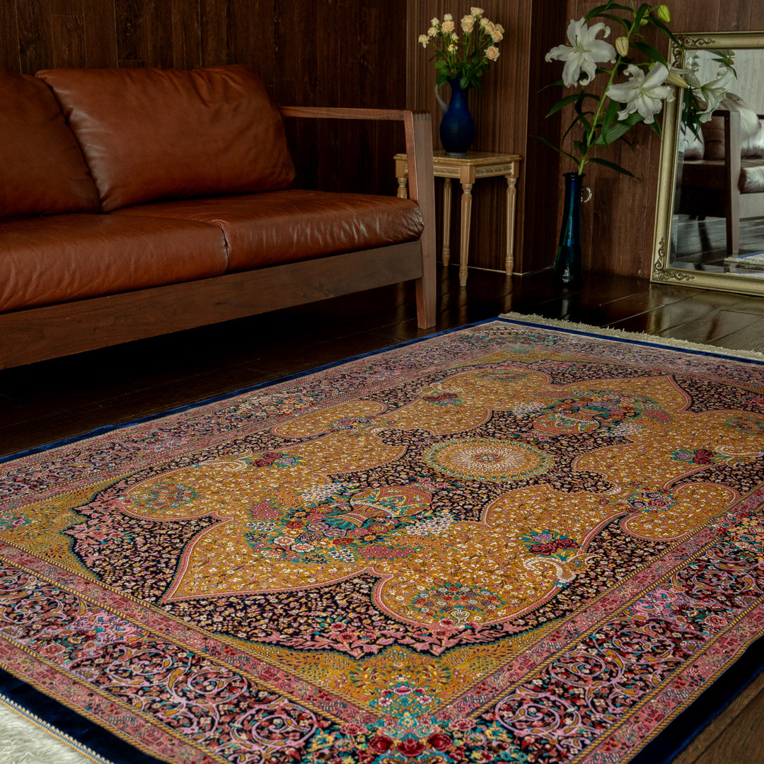 この絨毯は機械と手作業の両方で織られた織り目の細かい絨毯です。周りのフレームやフリンジの部分が手作業で織られ、より高級感のある丁寧な仕上がりが特徴です。