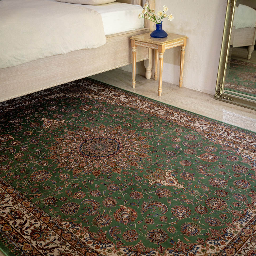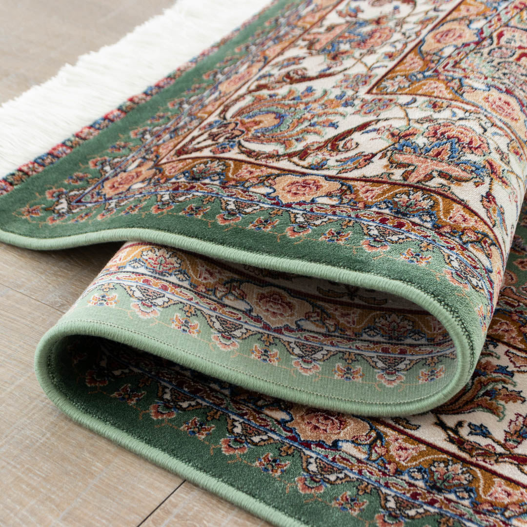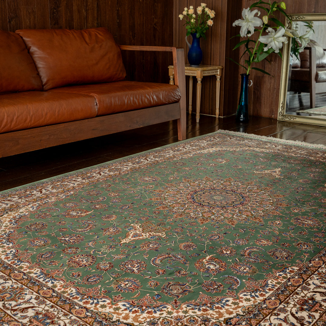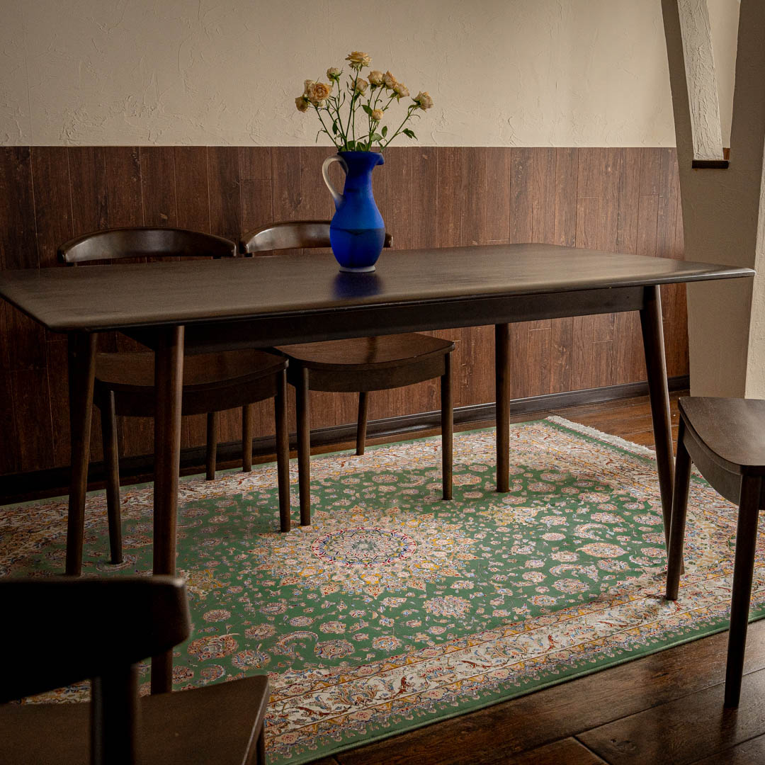 本場ペルシャ絨毯の産地イラン(ペルシャ)のデザイナーが柄を考案したこのシリーズは、ペルシャ絨毯らしい高級感はそのままに、手織りに近い技術を持つ機械で織ることによって、コストを抑えています。