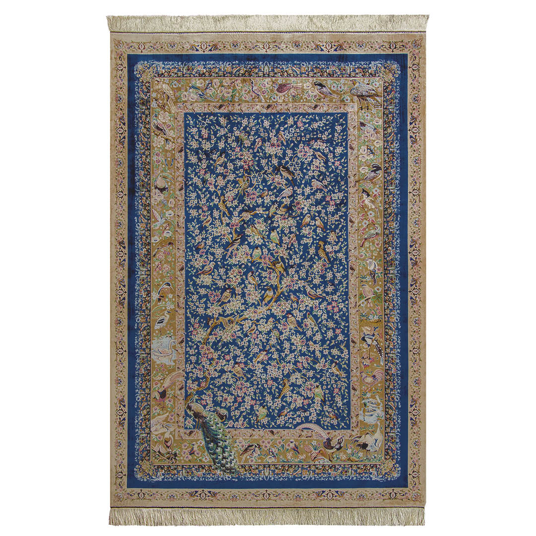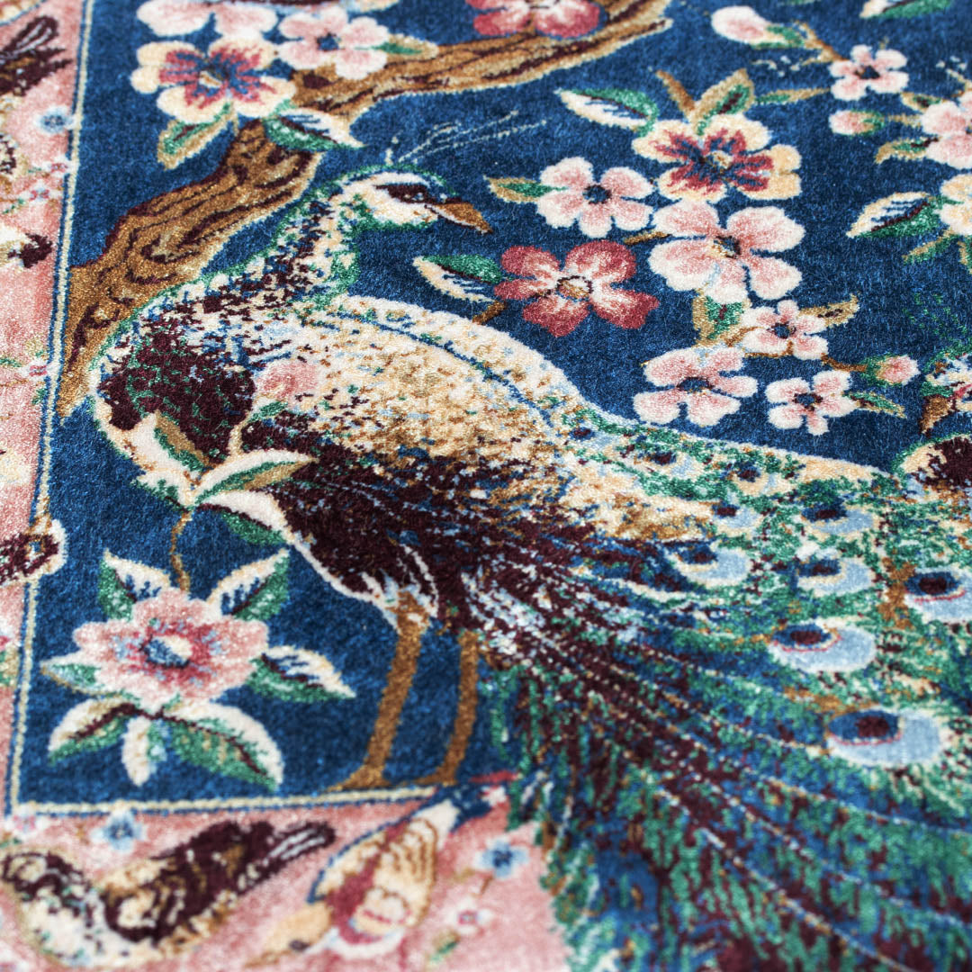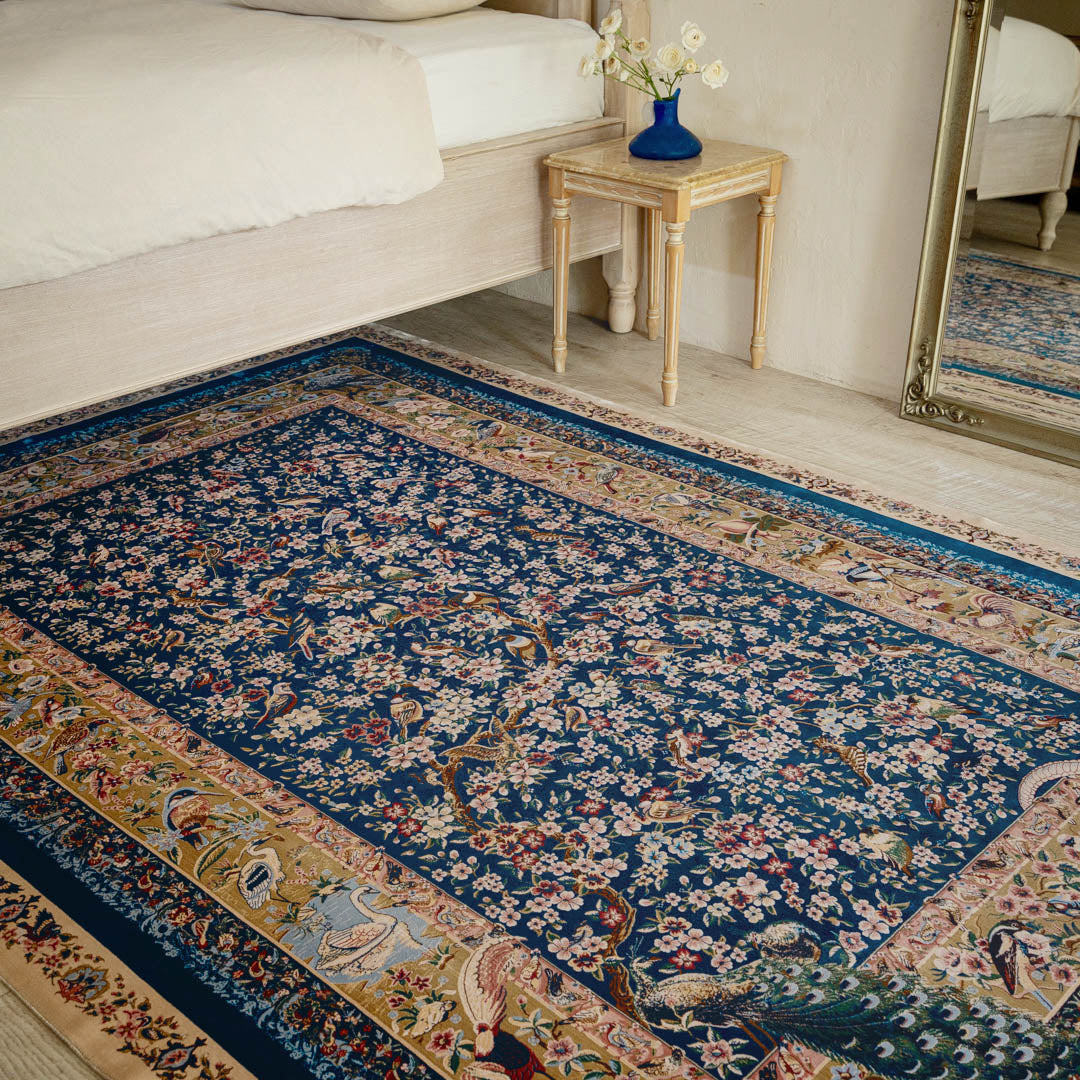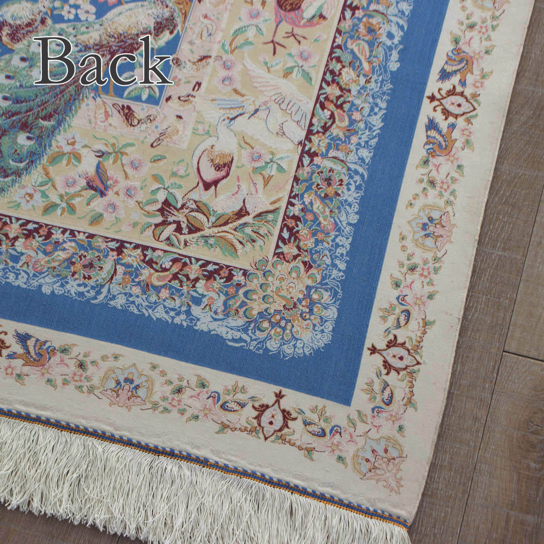 この絨毯は機械と手作業の両方で織られた織り目の細かい絨毯です。周りのフレームやフリンジの部分が手作業で織られ、より高級感のある丁寧な仕上がりが特徴です。