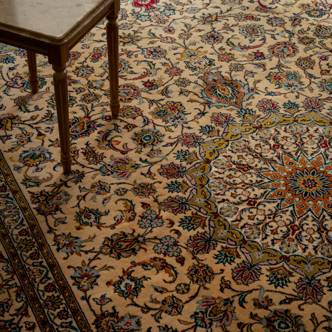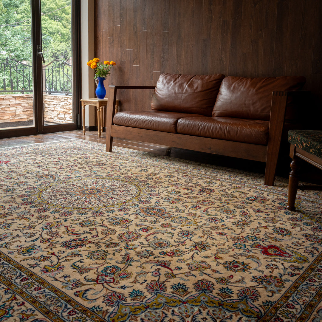 カーシャーンはイランの中央に位置する都市で、古くから絨毯の追究が行われている有名な絨毯産地です。絨毯の歴史は17世紀ごろにさかのぼります。絨毯の基礎にはコットンがよく使われ、パイルにはハイクオリティーのウールが使用されます。古いカーシャーンの絨毯にはシルクも含まれています。カーシャーンの特徴としては、伝統的なデザインのメダリオンやシャーアッバシーの花がよく使われています。また、クムとイスファハーンの間に位置しているため、両地域の工房の影響を受けたデザインが見られます。ネイビー、レッド、クリーム色がよく使用されます。カーシャーンの絨毯は、イスファハーンやクムに比べて手頃な価格で高品質なものが多くあります。