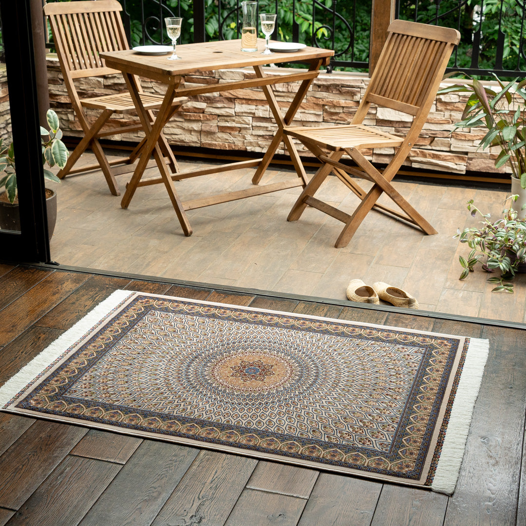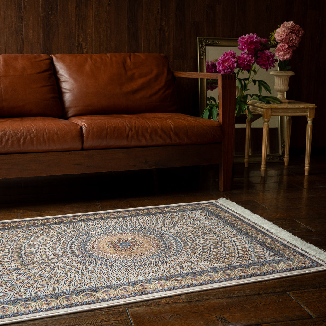 本場ペルシャ絨毯の産地イラン(ペルシャ)のデザイナーが柄を考案したこのシリーズは、ペルシャ絨毯らしい高級感はそのままに、手織りに近い技術を持つ機械で織ることによって、コストを抑えています。