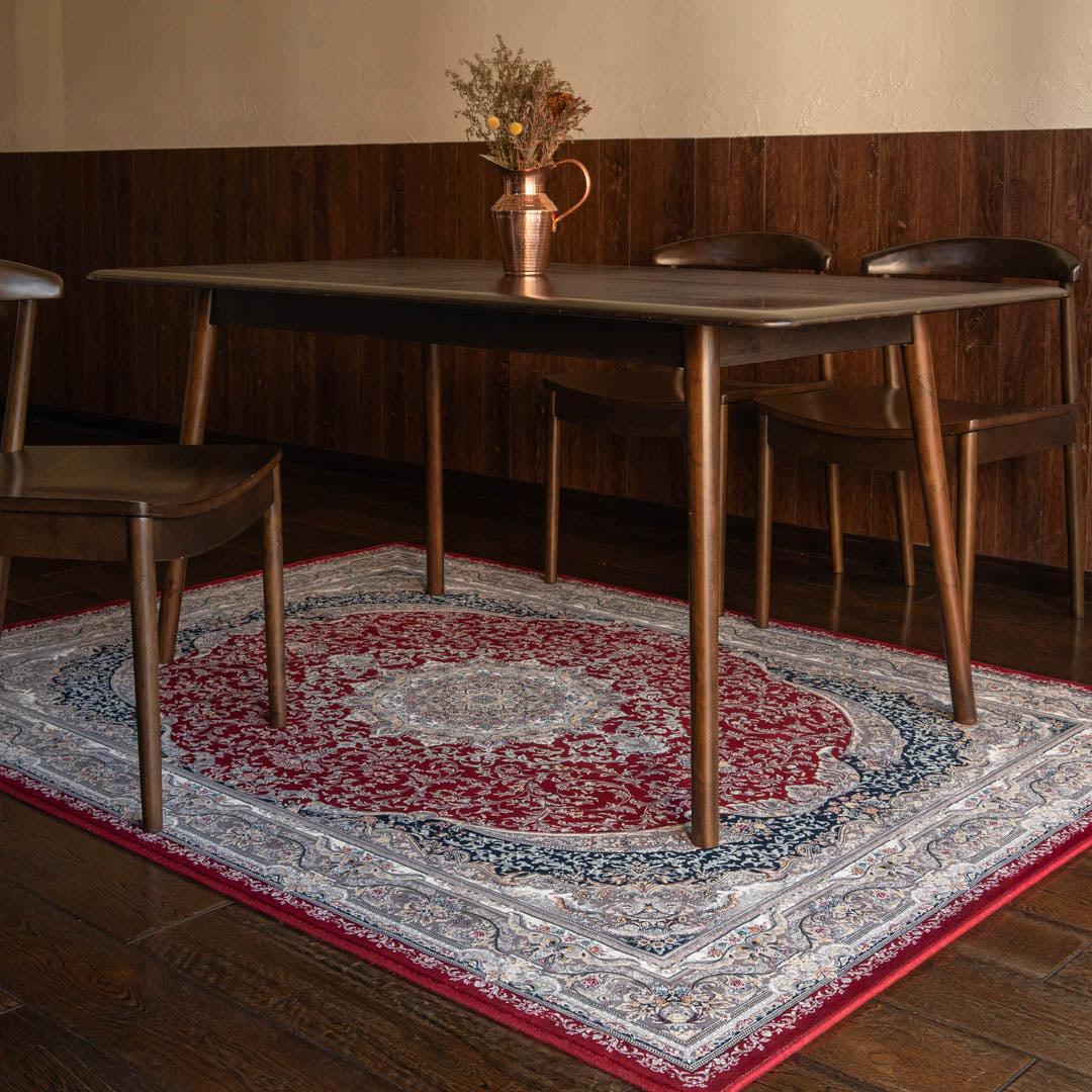 「ナールゴル」とはペルシャ語で「ザクロの花」を意味します。この絨毯のデザインは、中心部分から華やかに広がる有機的な模様を、ザクロの花を彷彿とさせるレッドが上品に引き立てています。特殊な技術により、花の模様が浮き上がり、立体感を演出しています。メダリオン柄がペルシャ絨毯らしいクラシックデザインを際立たせ、お部屋を華やかで上品に彩ります。