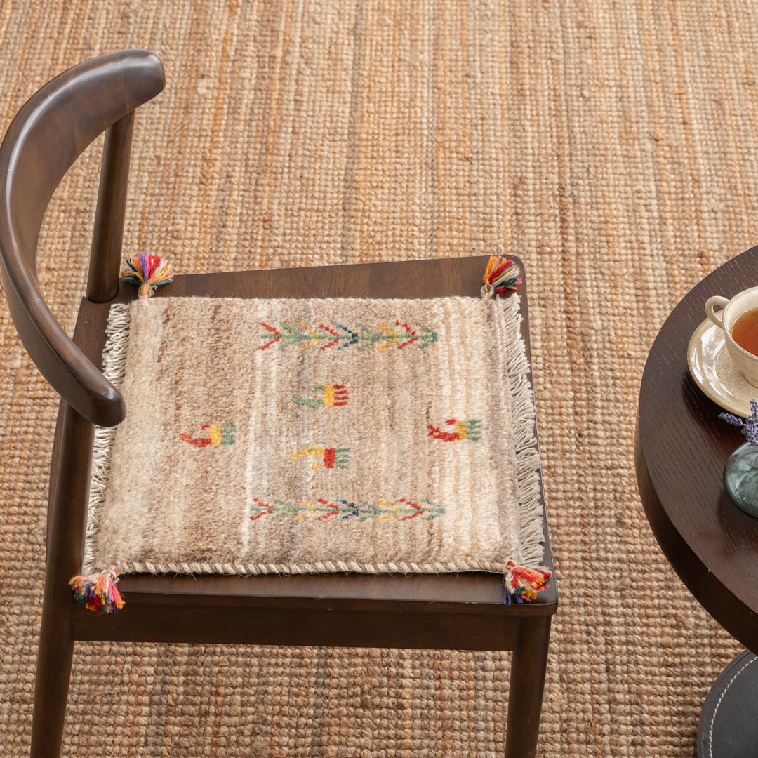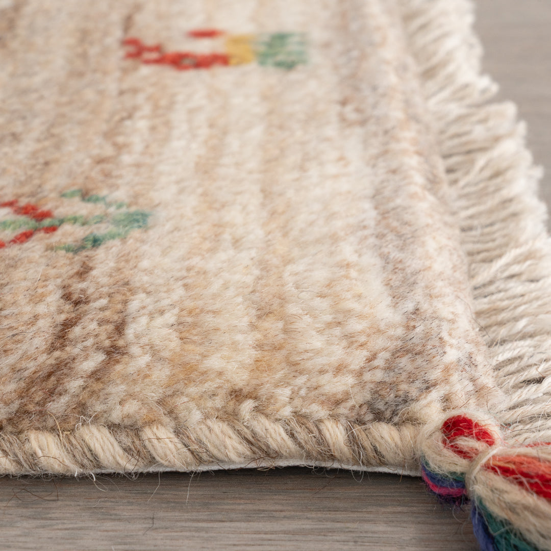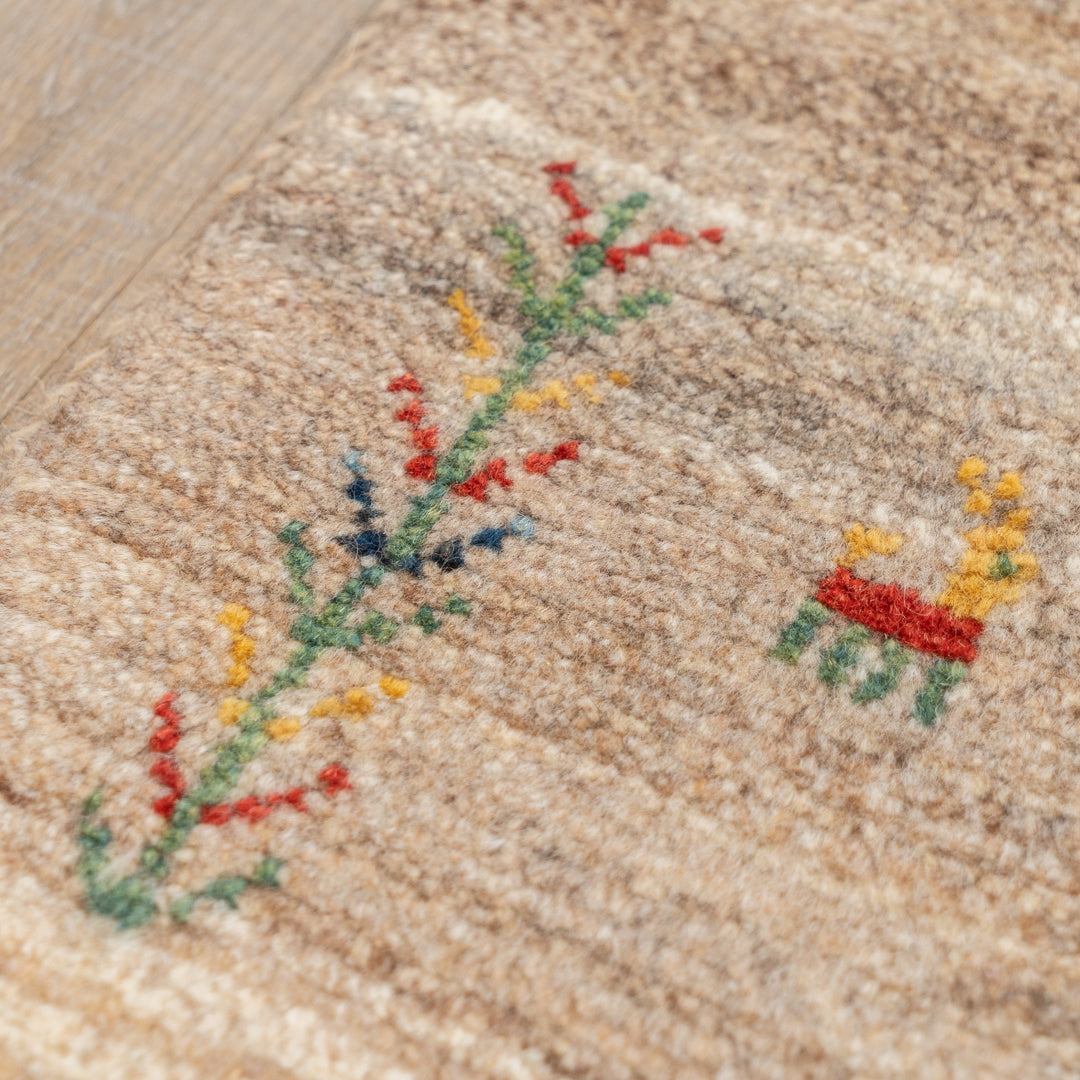 ギャッベはイランのザクロス山脈を遊牧しているカシュガイ族が手織りする、草木染の羊毛を使った毛足の長い生活に根付いた絨毯です。本商品に使用されているペルシャバリアントと呼ばれる羊毛は、過酷な環境であるザクロス山脈で生きていく為の優れた耐久性や、体温調整を上手に行うために多くの脂分を含んだ柔らかく触り心地の良い毛質を揃えています。