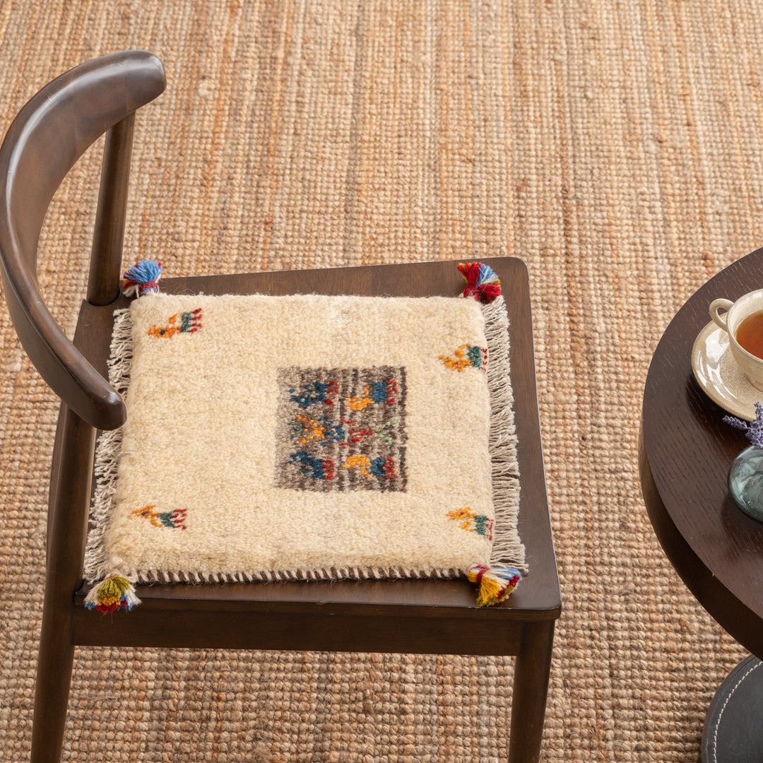 チェアパッドとしてダイニングテーブルの椅子、車の座席、座布団代わりにお使いいただけるペルシャ手織りギャッベ絨毯です。