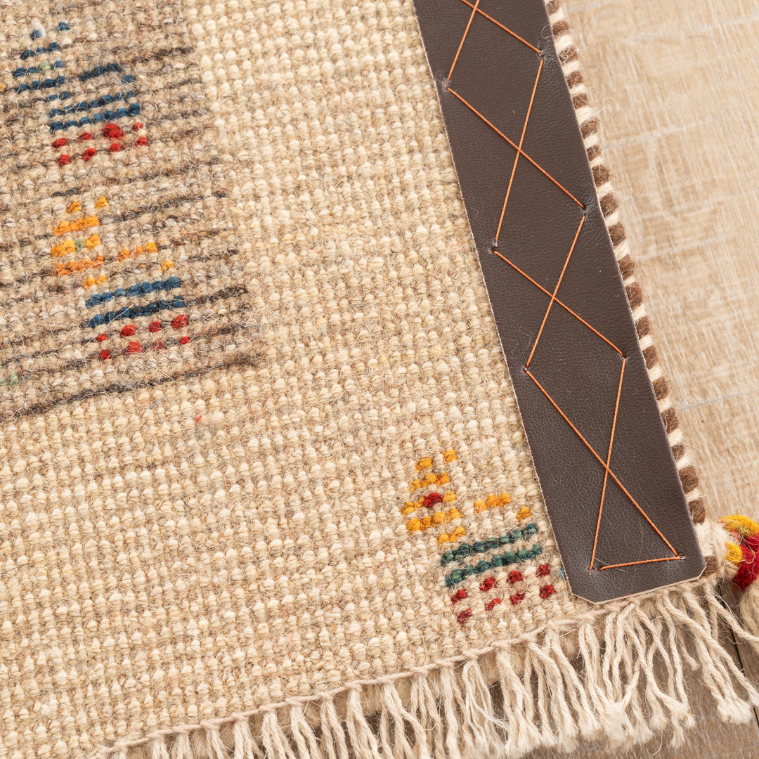 ギャッベはイランのザクロス山脈を遊牧しているカシュガイ族が手織りする、草木染の羊毛を使った毛足の長い生活に根付いた絨毯です。本商品に使用されているペルシャバリアントと呼ばれる羊毛は、過酷な環境であるザクロス山脈で生きていく為の優れた耐久性や、体温調整を上手に行うために多くの脂分を含んだ柔らかく触り心地の良い毛質を揃えています。