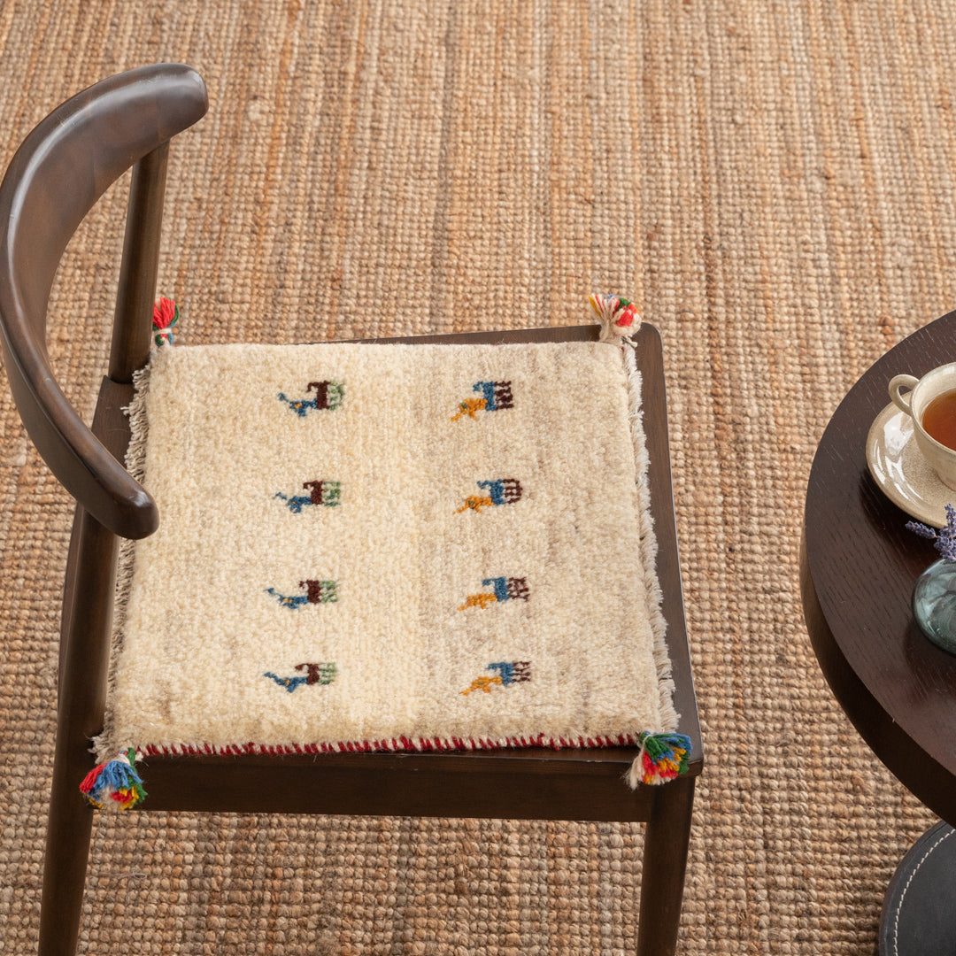 チェアパッドとしてダイニングテーブルの椅子、車の座席、座布団代わりにお使いいただけるペルシャ手織りギャッベ絨毯です。