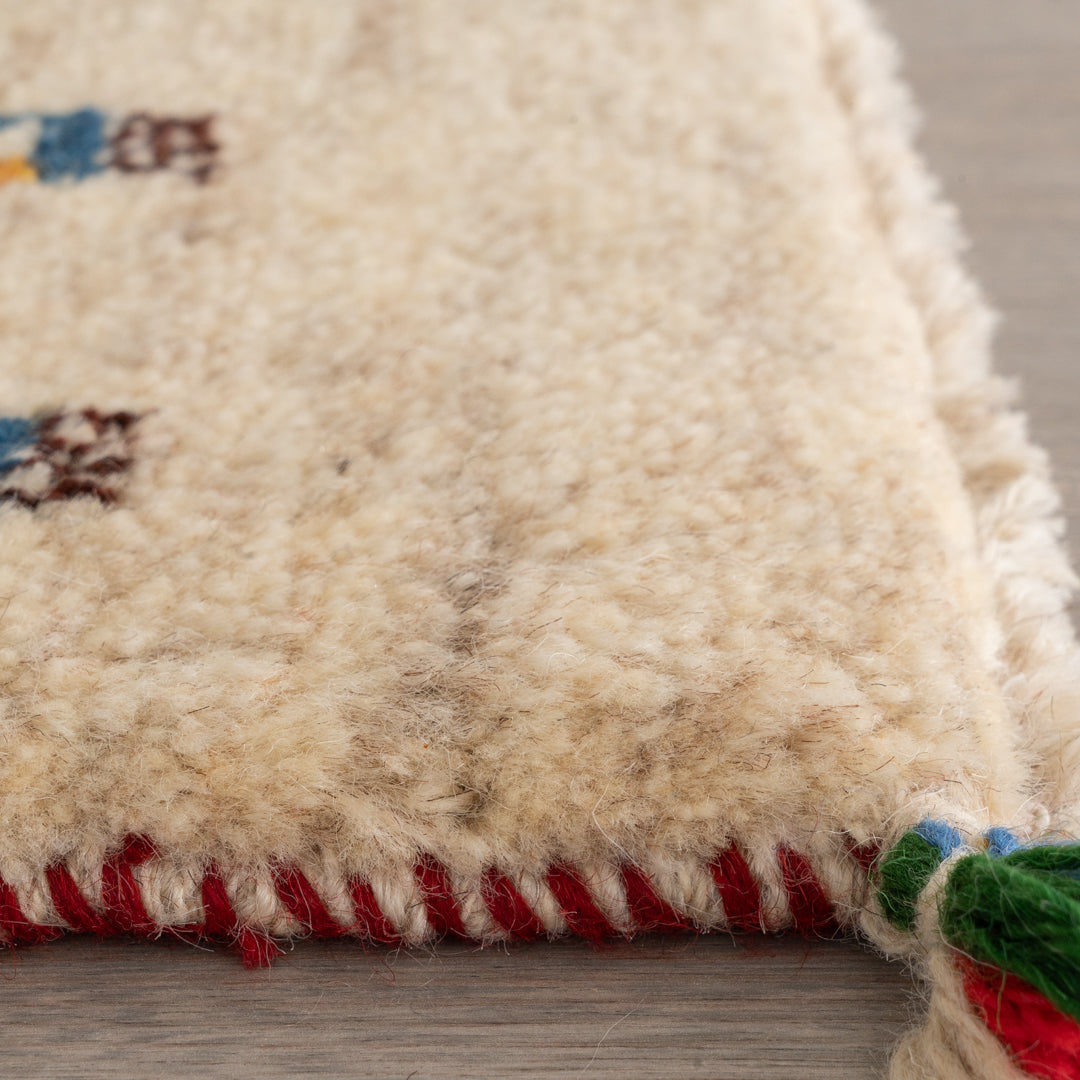 ギャッベはイランのザクロス山脈を遊牧しているカシュガイ族が手織りする、草木染の羊毛を使った毛足の長い生活に根付いた絨毯です。本商品に使用されているペルシャバリアントと呼ばれる羊毛は、過酷な環境であるザクロス山脈で生きていく為の優れた耐久性や、体温調整を上手に行うために多くの脂分を含んだ柔らかく触り心地の良い毛質を揃えています。