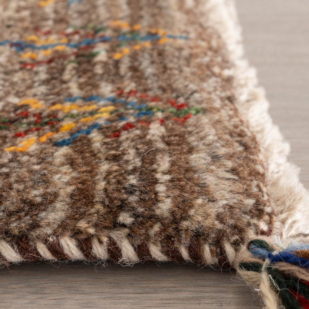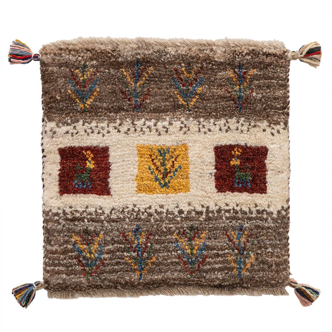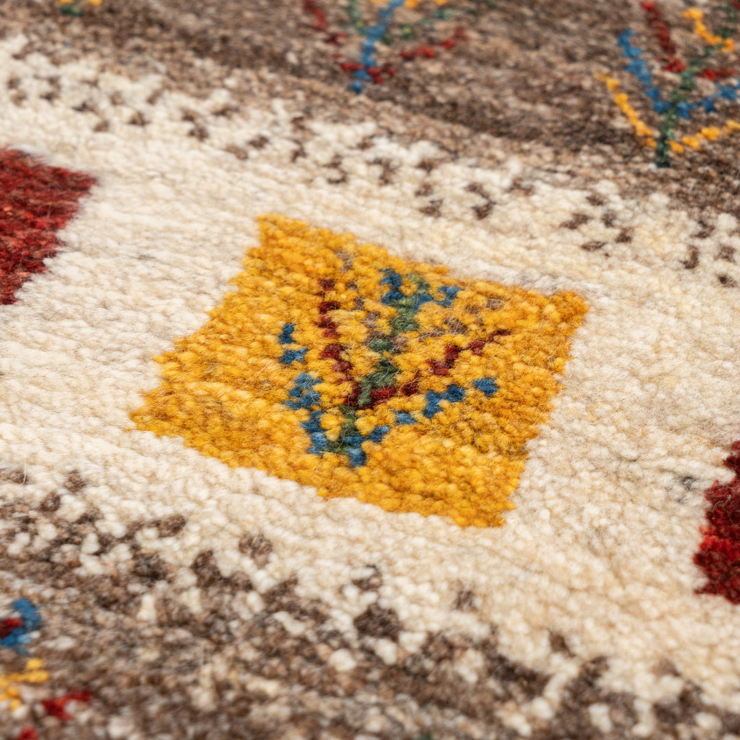 ギャッベはイランのザクロス山脈を遊牧しているカシュガイ族が手織りする、草木染の羊毛を使った毛足の長い生活に根付いた絨毯です。本商品に使用されているペルシャバリアントと呼ばれる羊毛は、過酷な環境であるザクロス山脈で生きていく為の優れた耐久性や、体温調整を上手に行うために多くの脂分を含んだ柔らかく触り心地の良い毛質を揃えています。