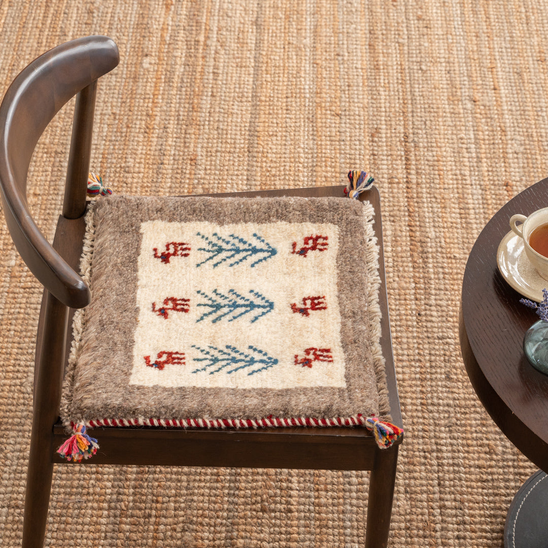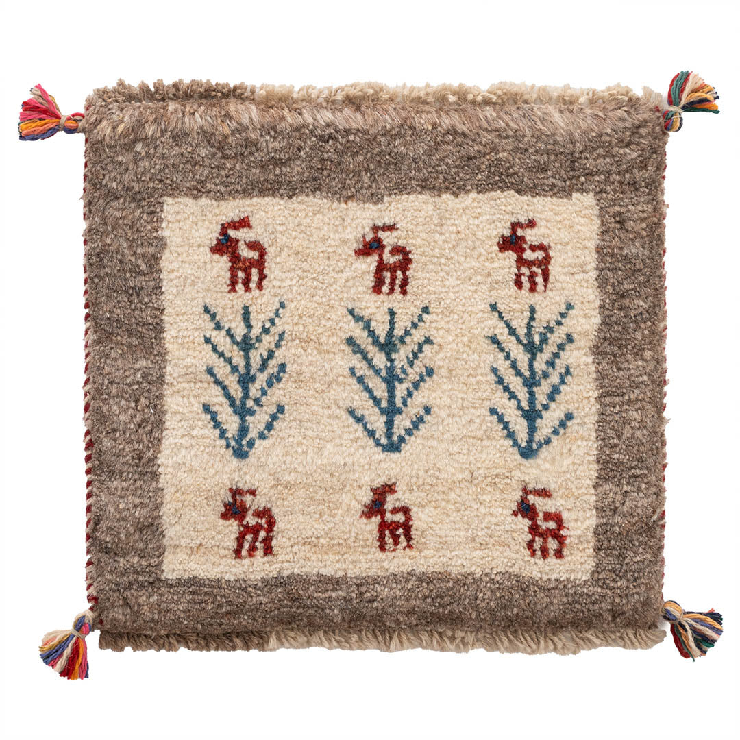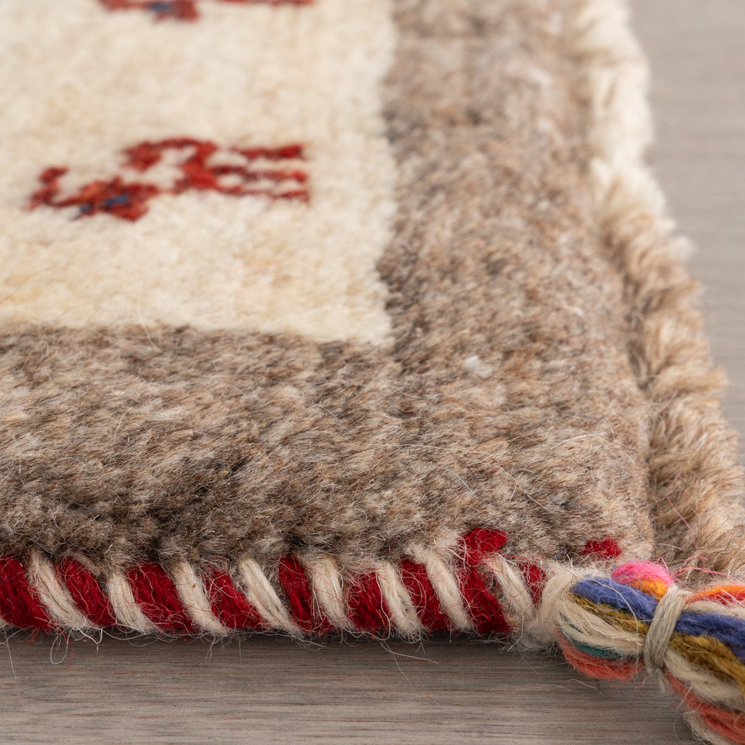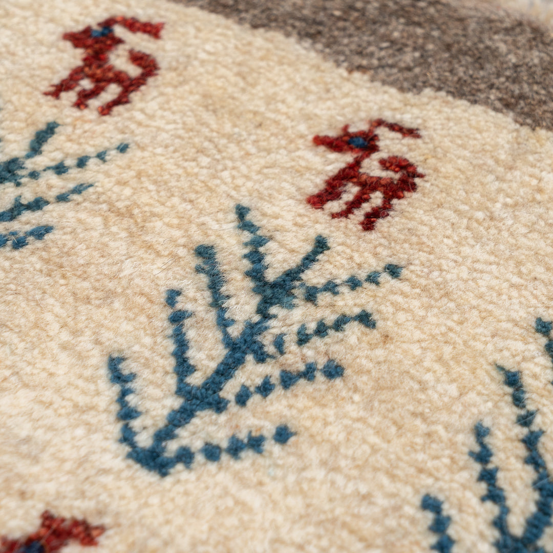 ギャッベはイランのザクロス山脈を遊牧しているカシュガイ族が手織りする、草木染の羊毛を使った毛足の長い生活に根付いた絨毯です。本商品に使用されているペルシャバリアントと呼ばれる羊毛は、過酷な環境であるザクロス山脈で生きていく為の優れた耐久性や、体温調整を上手に行うために多くの脂分を含んだ柔らかく触り心地の良い毛質を揃えています。