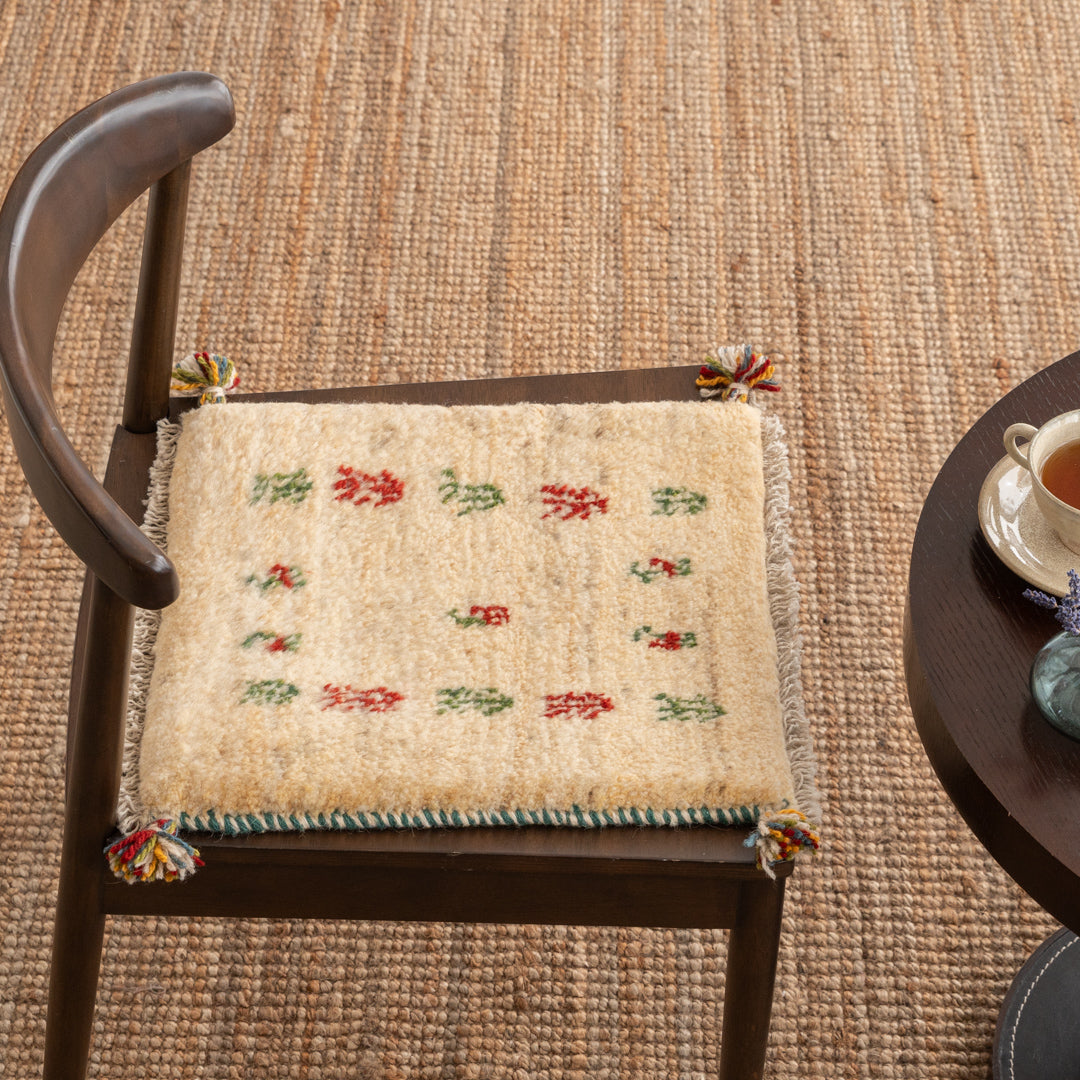 チェアパッドとしてダイニングテーブルの椅子、車の座席、座布団代わりにお使いいただけるペルシャ手織りギャッベ絨毯です。
