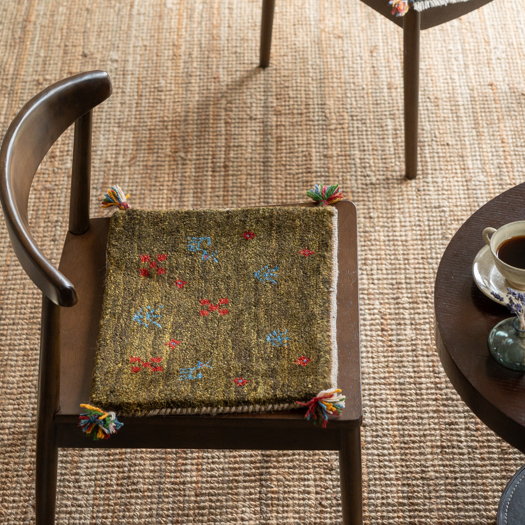 チェアパッドとしてダイニングテーブルの椅子、車の座席、座布団代わりにお使いいただけるペルシャ手織りギャッベ絨毯です。