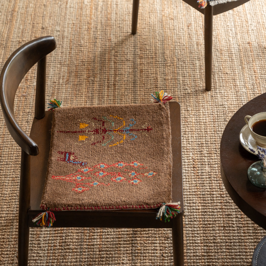 チェアパッドとしてダイニングテーブルの椅子、車の座席、座布団代わりにお使いいただけるペルシャ手織りギャッベ絨毯です。