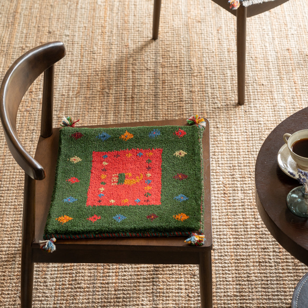 チェアパッドとしてダイニングテーブルの椅子、車の座席、座布団代わりにお使いいただけるペルシャ手織りギャッベ絨毯です。