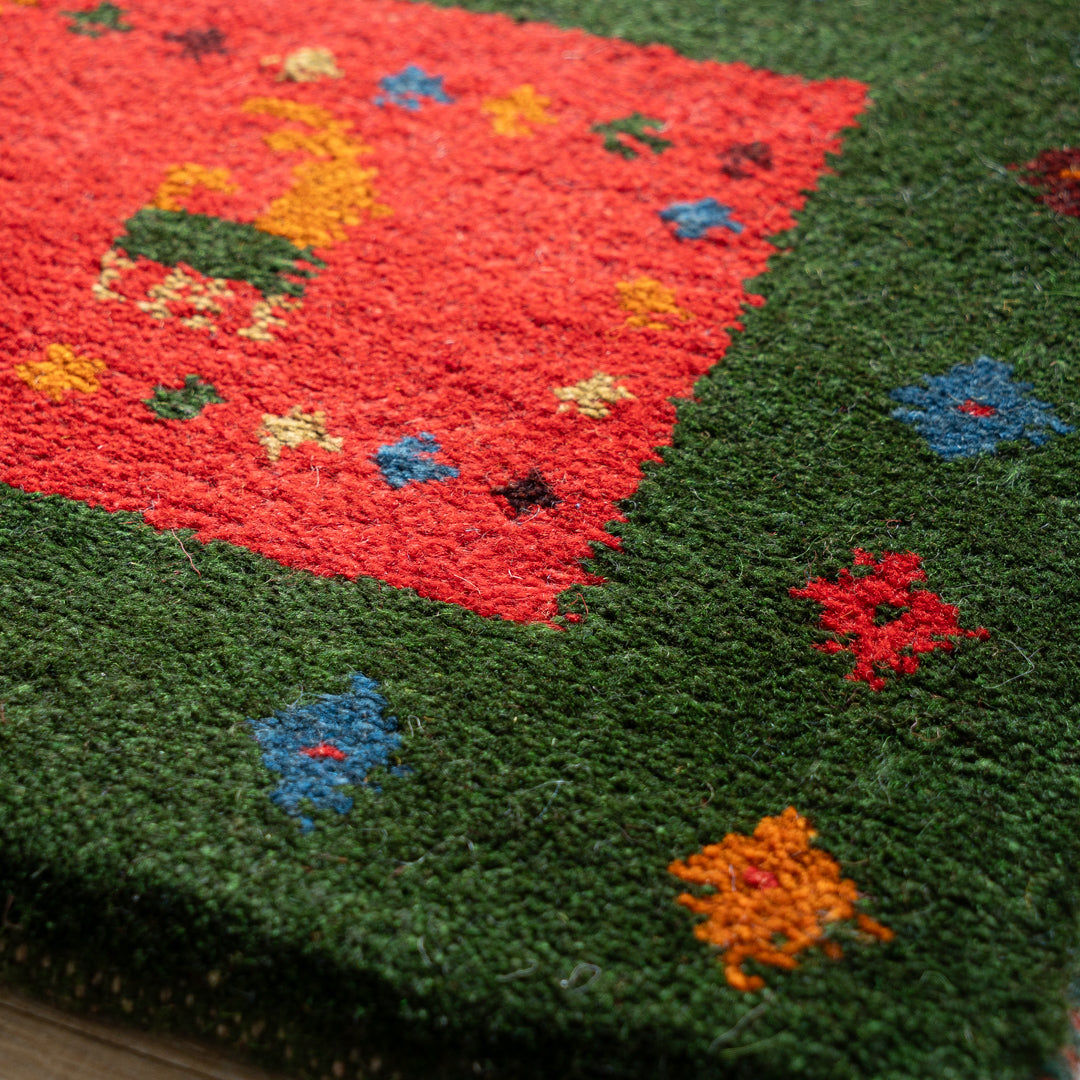 その羊毛を天然染料で染めて、イランの遊牧民が1本1本丁寧に手で織ったギャッベはフカフカで気持ち良い肌ざわりなのが特徴です。