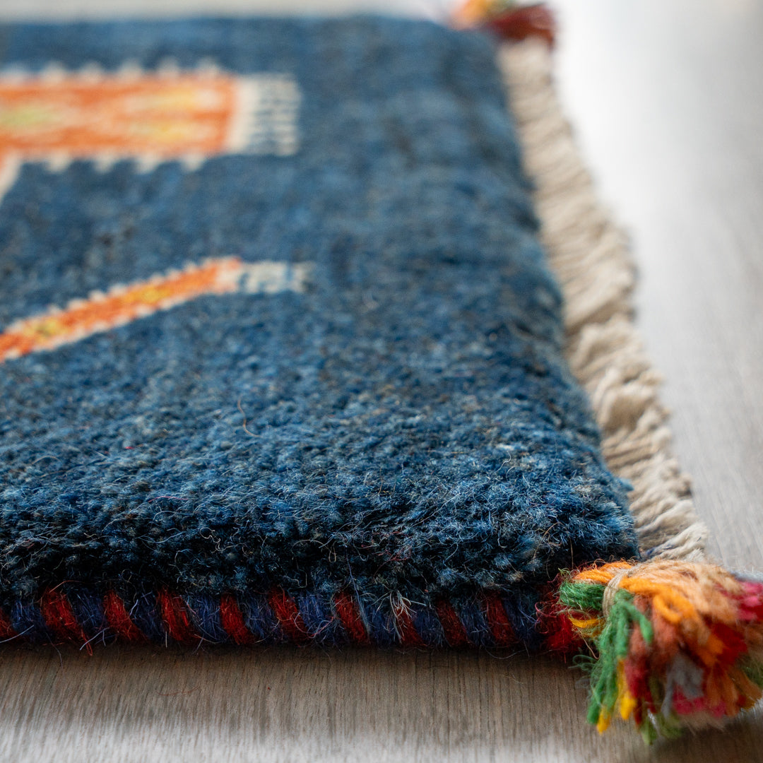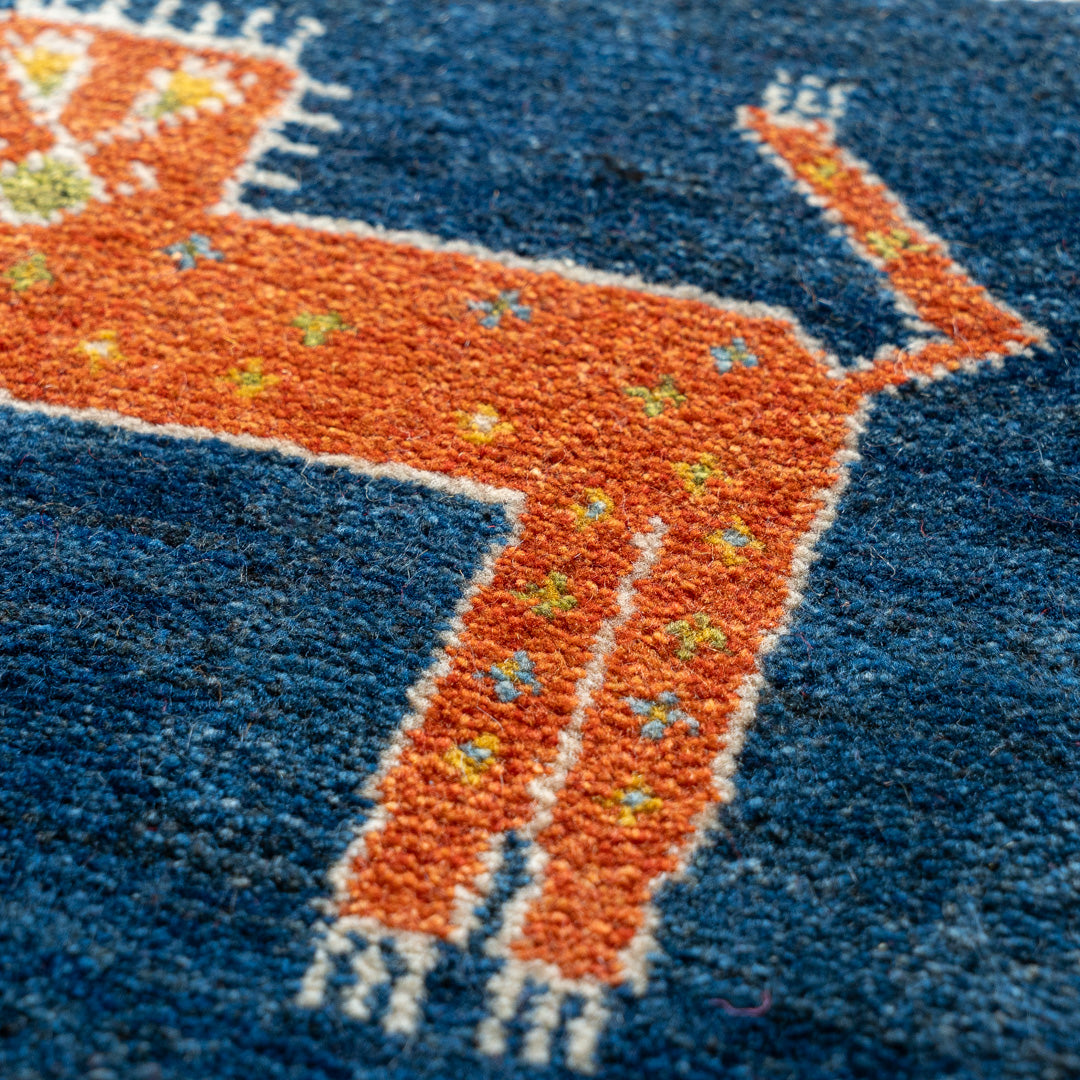 ギャッベはイランのザクロス山脈を遊牧しているカシュガイ族が手織りする、草木染の羊毛を使った毛足の長い生活に根付いた絨毯です。本商品に使用されているペルシャバリアントと呼ばれる羊毛は、過酷な環境であるザクロス山脈で生きていく為の優れた耐久性や、体温調整を上手に行うために多くの脂分を含んだ柔らかく触り心地の良い毛質を揃えています。