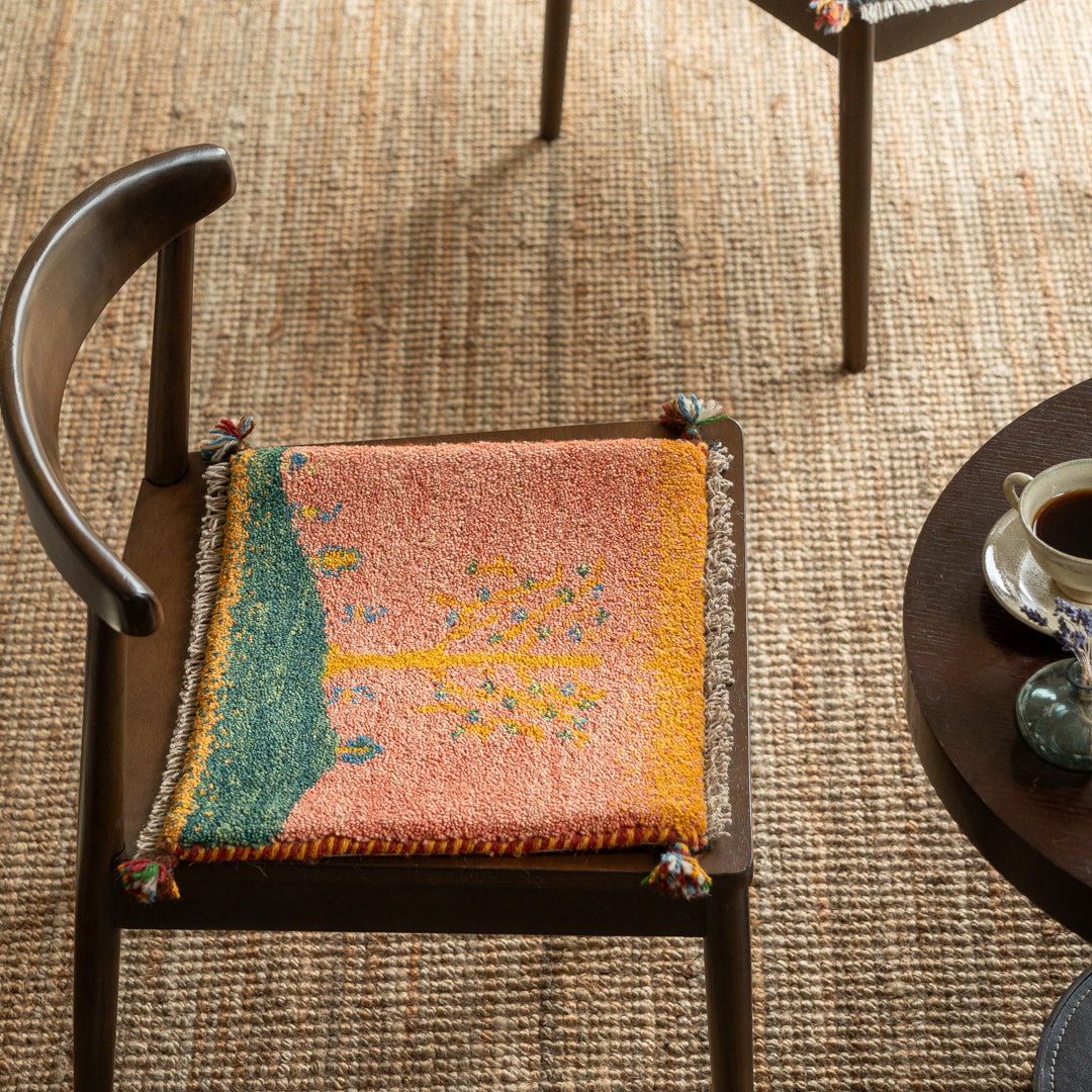 チェアパッドとしてダイニングテーブルの椅子、車の座席、座布団代わりにお使いいただけるペルシャ手織りギャッベ絨毯です。