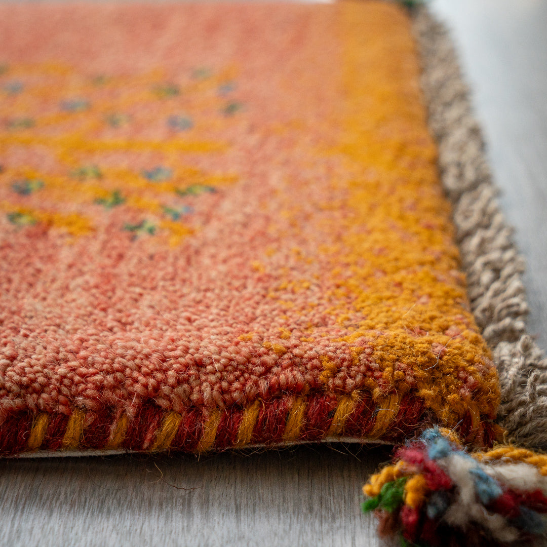 その羊毛を天然染料で染めて、イランの遊牧民が1本1本丁寧に手で織ったギャッベはフカフカで気持ち良い肌ざわりなのが特徴です。