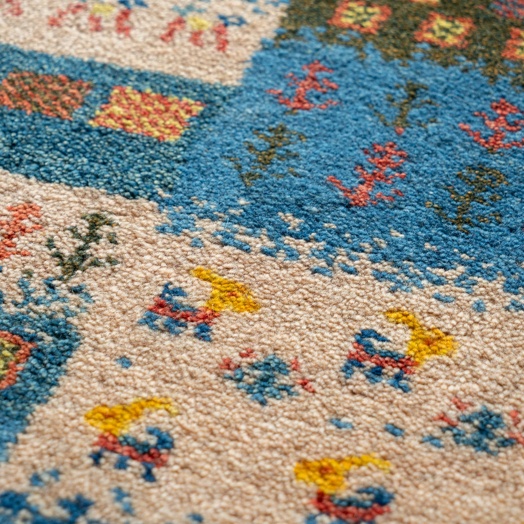 ギャッベはイランのザクロス山脈を遊牧しているカシュガイ族が手織りする、草木染の羊毛を使った毛足の長い生活に根付いた絨毯です。本商品に使用されているペルシャバリアントと呼ばれる羊毛は、過酷な環境であるザクロス山脈で生きていく為の優れた耐久性や、体温調整を上手に行うために多くの脂分を含んだ柔らかく触り心地の良い毛質を揃えています。