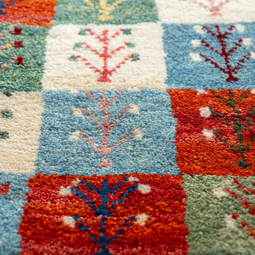 その羊毛を天然染料で染めて、イランの遊牧民が1本1本丁寧に手で織ったギャッベはフカフカで気持ち良い肌ざわりなのが特徴です。