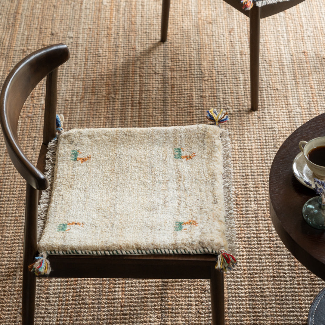 チェアパッドとしてダイニングテーブルの椅子、車の座席、座布団代わりにお使いいただけるペルシャ手織りギャッベ絨毯です。