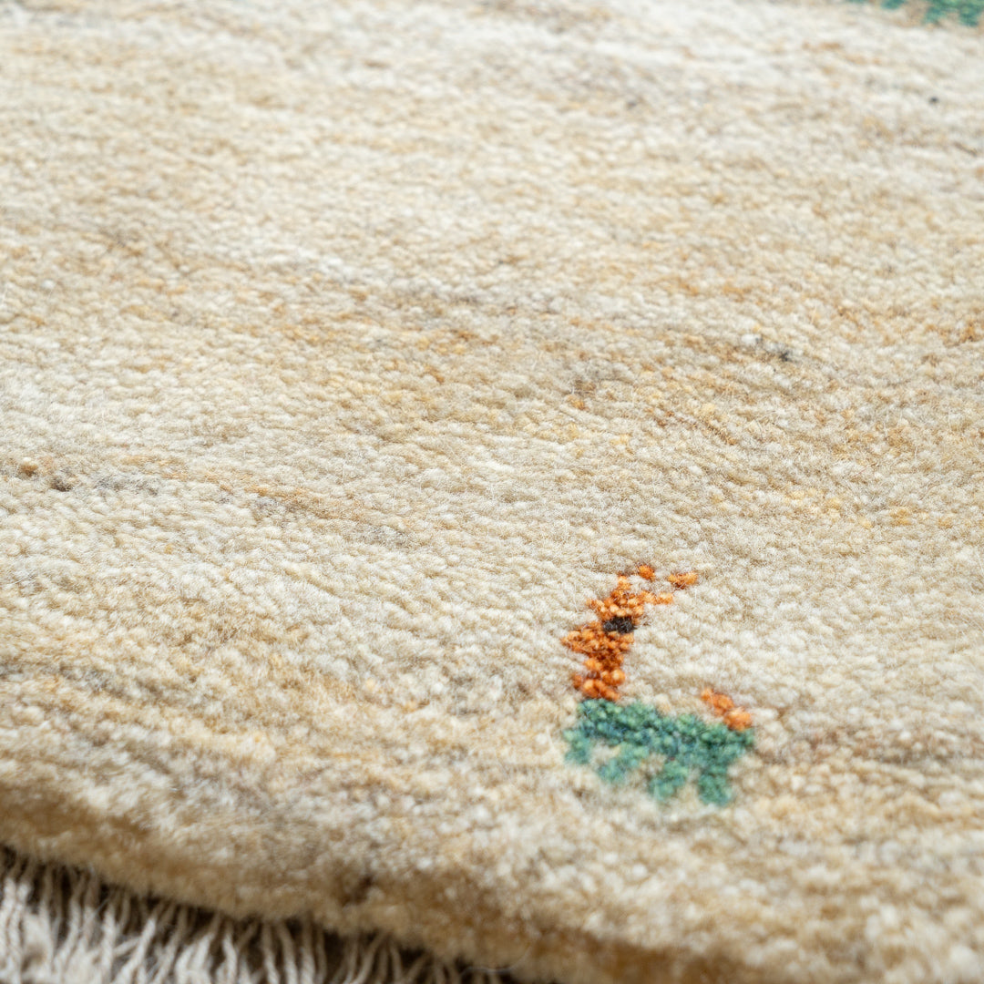 ギャッベはイランのザクロス山脈を遊牧しているカシュガイ族が手織りする、草木染の羊毛を使った毛足の長い生活に根付いた絨毯です。本商品に使用されているペルシャバリアントと呼ばれる羊毛は、過酷な環境であるザクロス山脈で生きていく為の優れた耐久性や、体温調整を上手に行うために多くの脂分を含んだ柔らかく触り心地の良い毛質を揃えています。