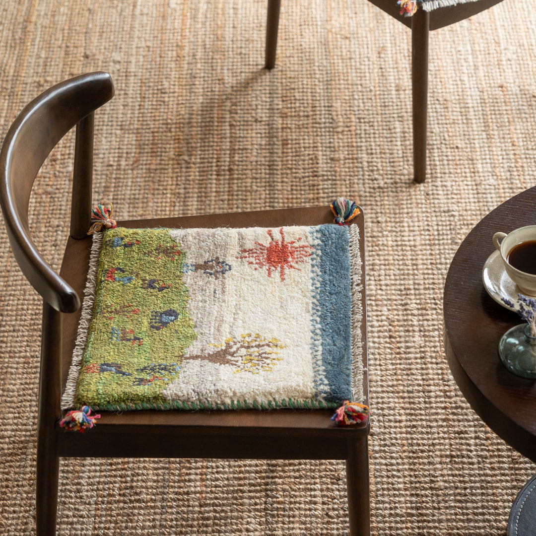 チェアパッドとしてダイニングテーブルの椅子、車の座席、座布団代わりにお使いいただけるペルシャ手織りギャッベ絨毯です。