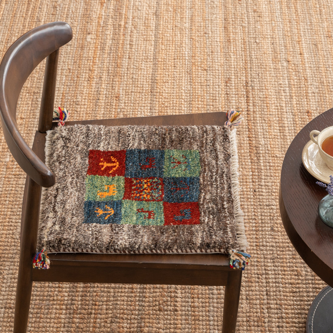 チェアパッドとしてダイニングテーブルの椅子、車の座席、座布団代わりにお使いいただけるペルシャ手織りギャッベ絨毯です。