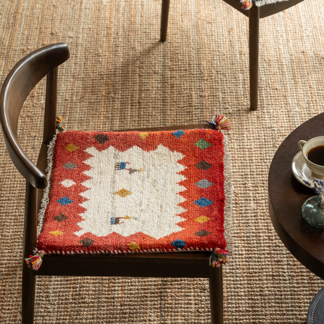 チェアパッドとしてダイニングテーブルの椅子、車の座席、座布団代わりにお使いいただけるペルシャ手織りギャッベ絨毯です。