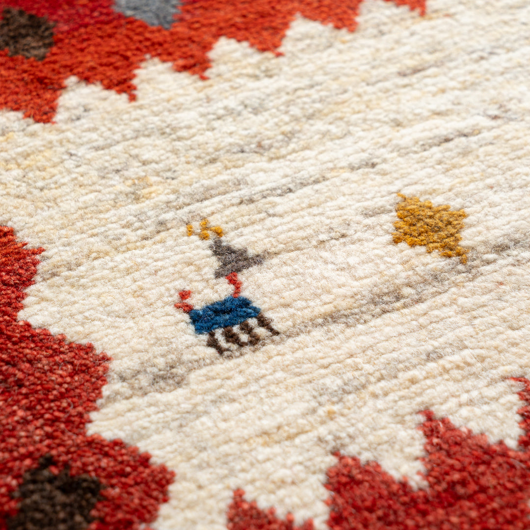 ギャッベはイランのザクロス山脈を遊牧しているカシュガイ族が手織りする、草木染の羊毛を使った毛足の長い生活に根付いた絨毯です。本商品に使用されているペルシャバリアントと呼ばれる羊毛は、過酷な環境であるザクロス山脈で生きていく為の優れた耐久性や、体温調整を上手に行うために多くの脂分を含んだ柔らかく触り心地の良い毛質を揃えています。