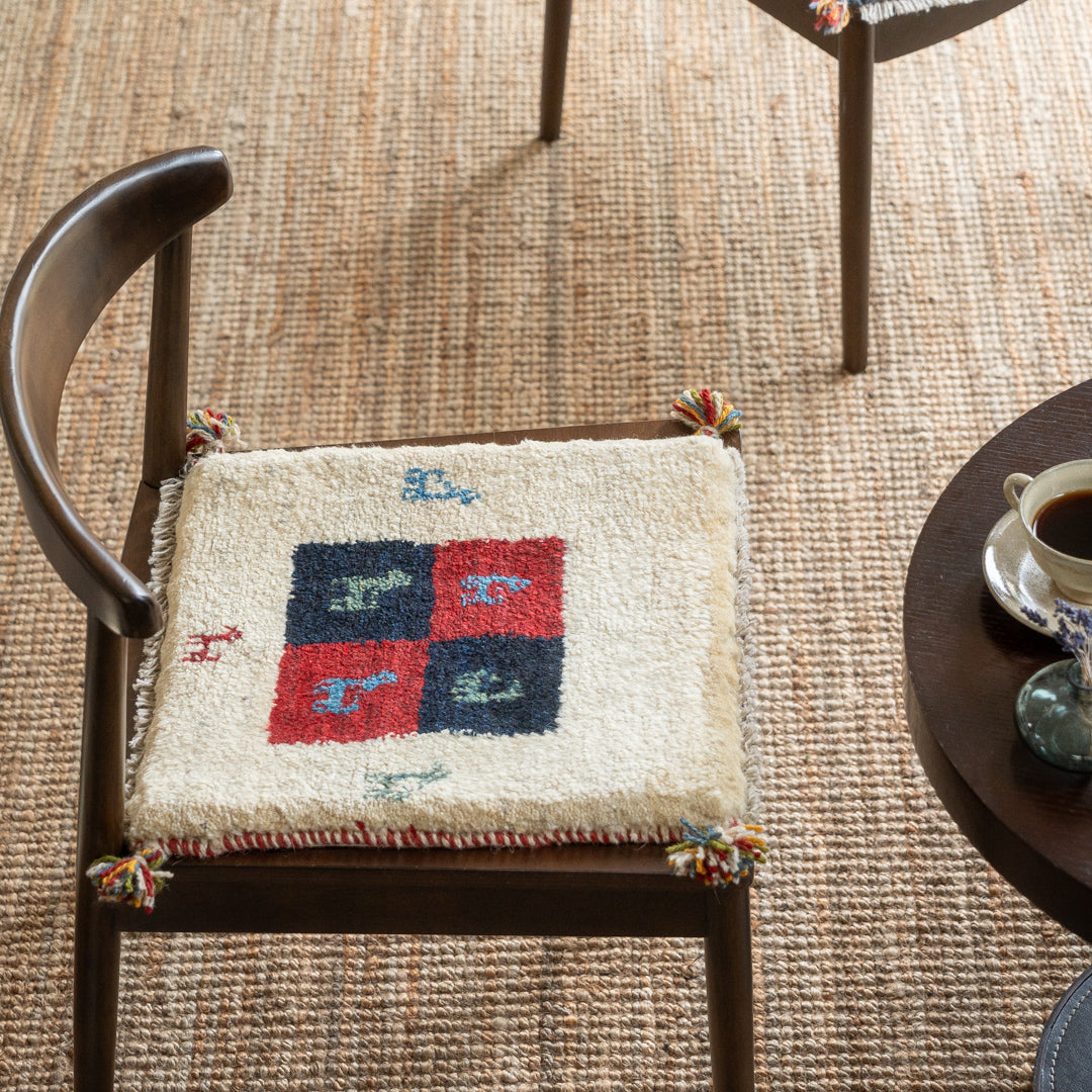 チェアパッドとしてダイニングテーブルの椅子、車の座席、座布団代わりにお使いいただけるペルシャ手織りギャッベ絨毯です。
