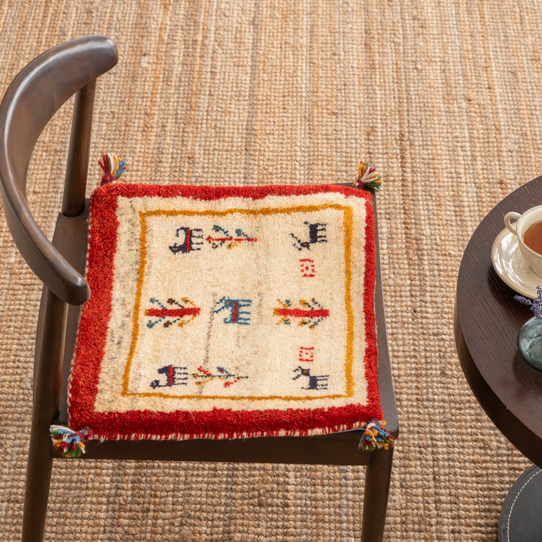チェアパッドとしてダイニングテーブルの椅子、車の座席、座布団代わりにお使いいただけるペルシャ手織りギャッベ絨毯です。