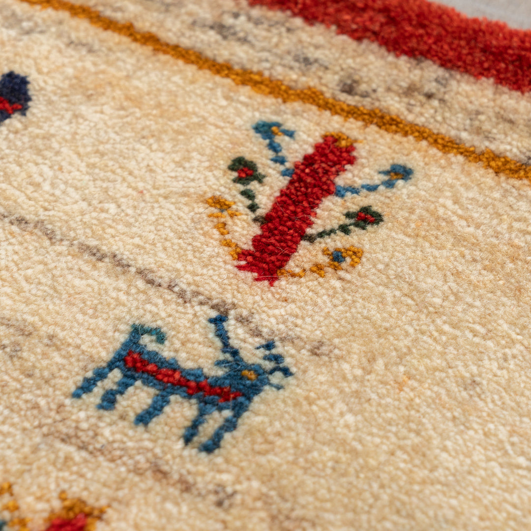 ギャッベはイランのザクロス山脈を遊牧しているカシュガイ族が手織りする、草木染の羊毛を使った毛足の長い生活に根付いた絨毯です。本商品に使用されているペルシャバリアントと呼ばれる羊毛は、過酷な環境であるザクロス山脈で生きていく為の優れた耐久性や、体温調整を上手に行うために多くの脂分を含んだ柔らかく触り心地の良い毛質を揃えています。