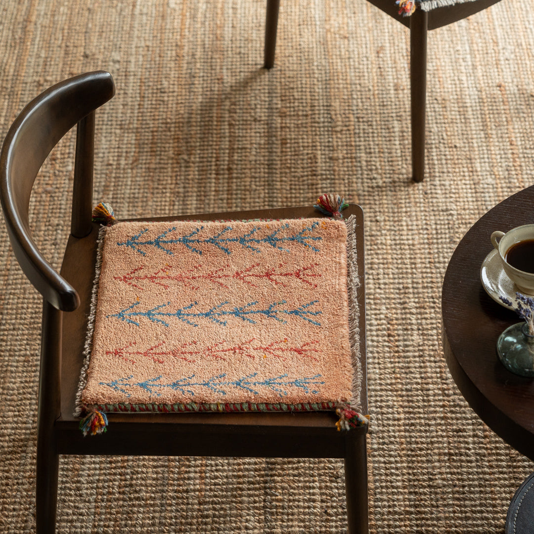 チェアパッドとしてダイニングテーブルの椅子、車の座席、座布団代わりにお使いいただけるペルシャ手織りギャッベ絨毯です。