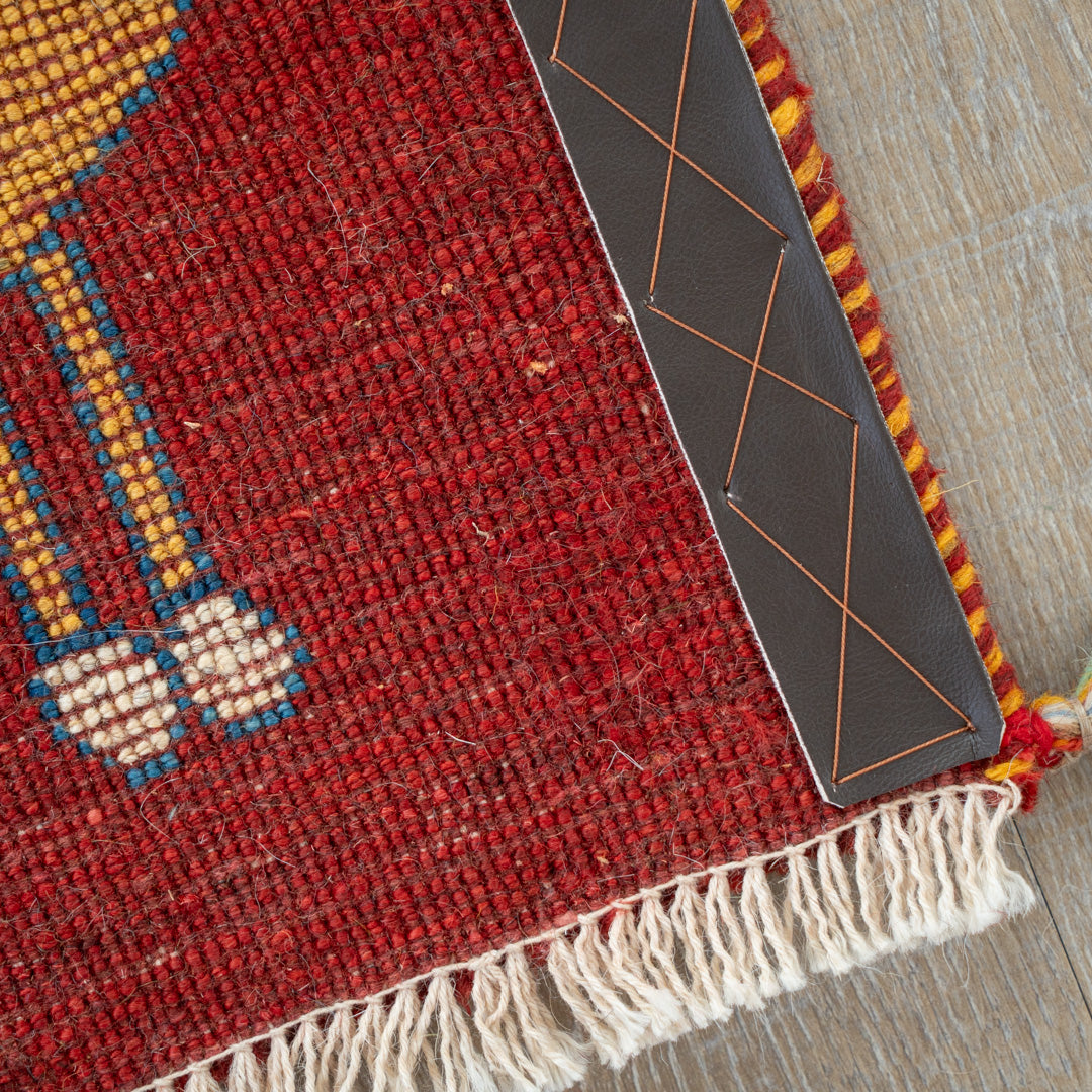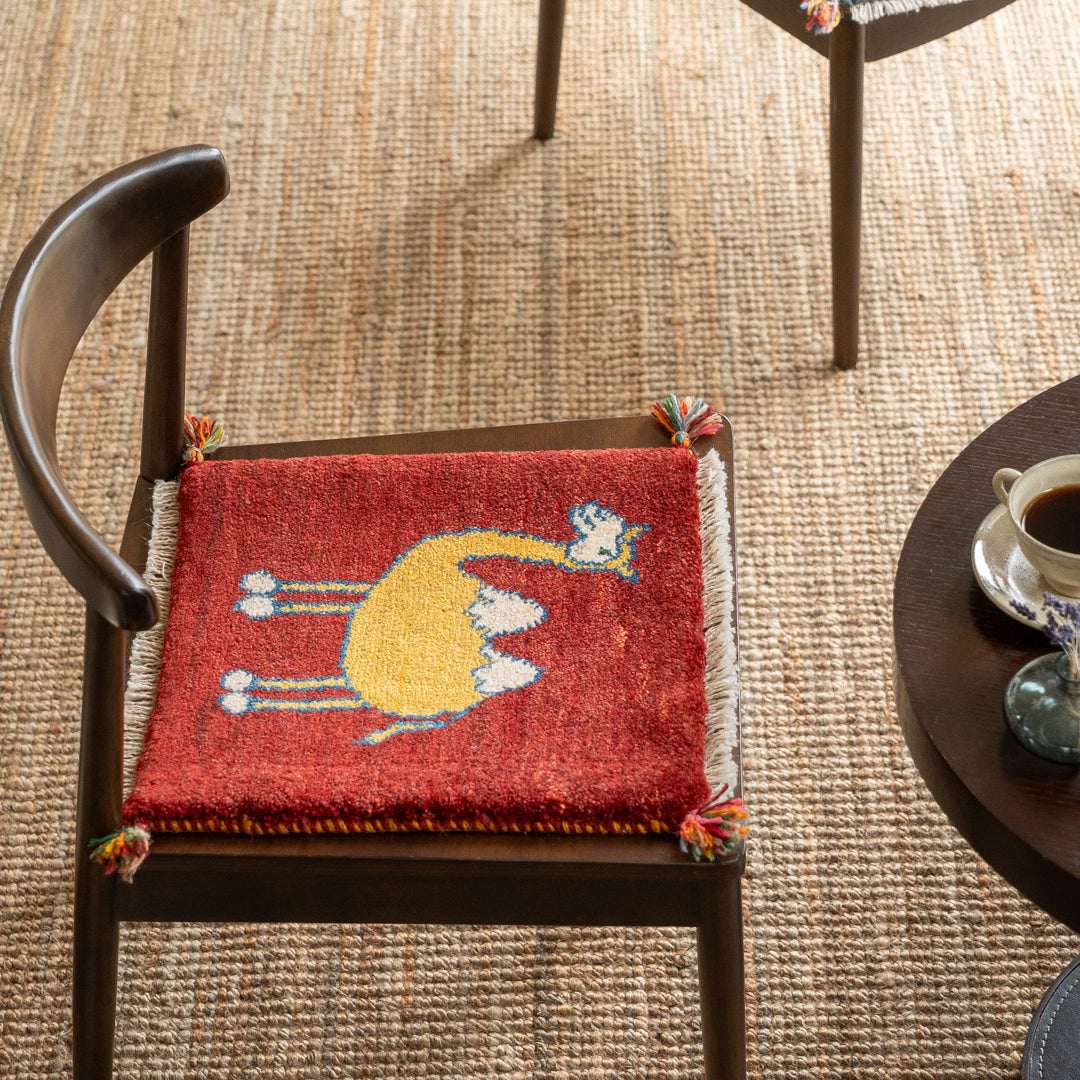 チェアパッドとしてダイニングテーブルの椅子、車の座席、座布団代わりにお使いいただけるペルシャ手織りギャッベ絨毯です。