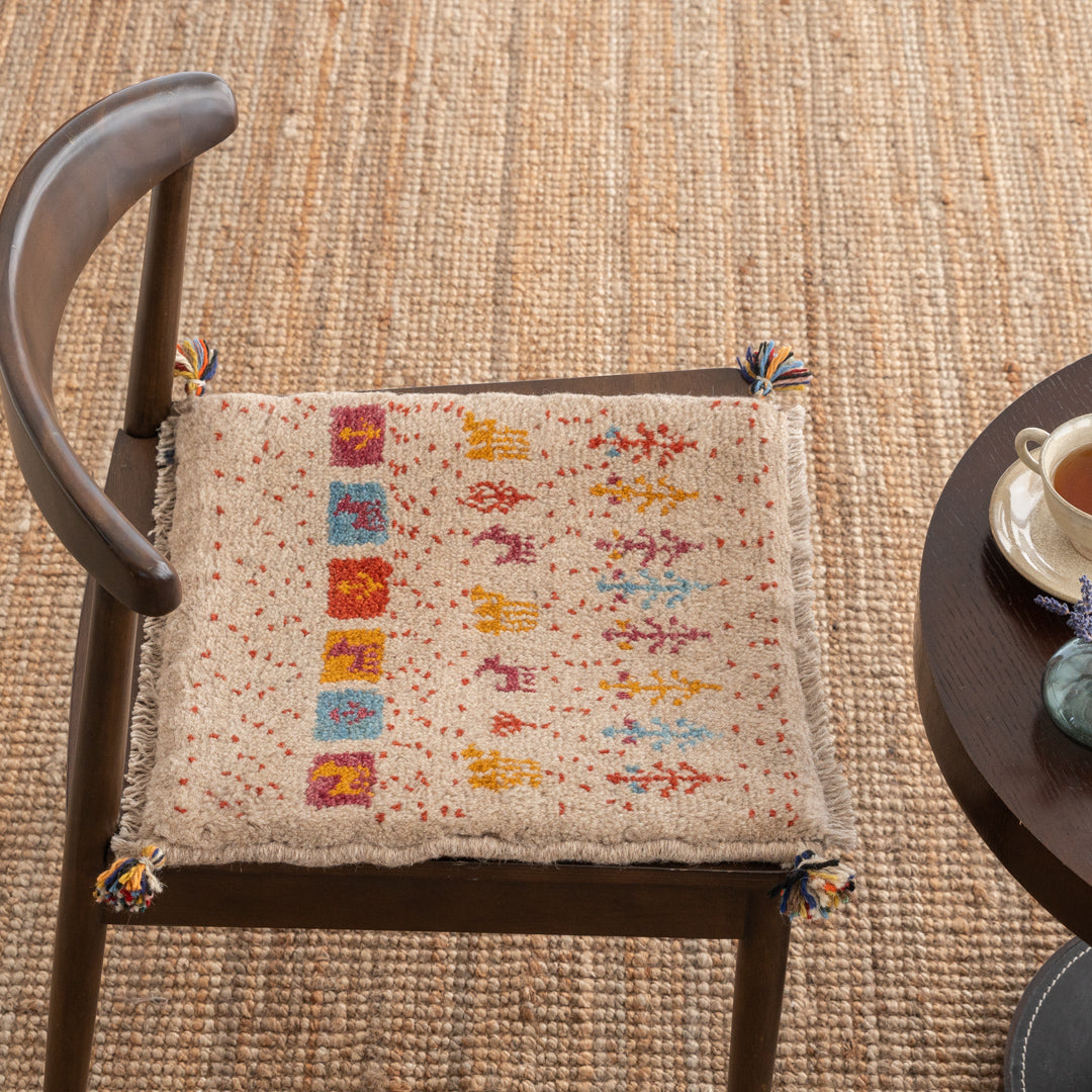チェアパッドとしてダイニングテーブルの椅子、車の座席、座布団代わりにお使いいただけるペルシャ手織りギャッベ絨毯です。