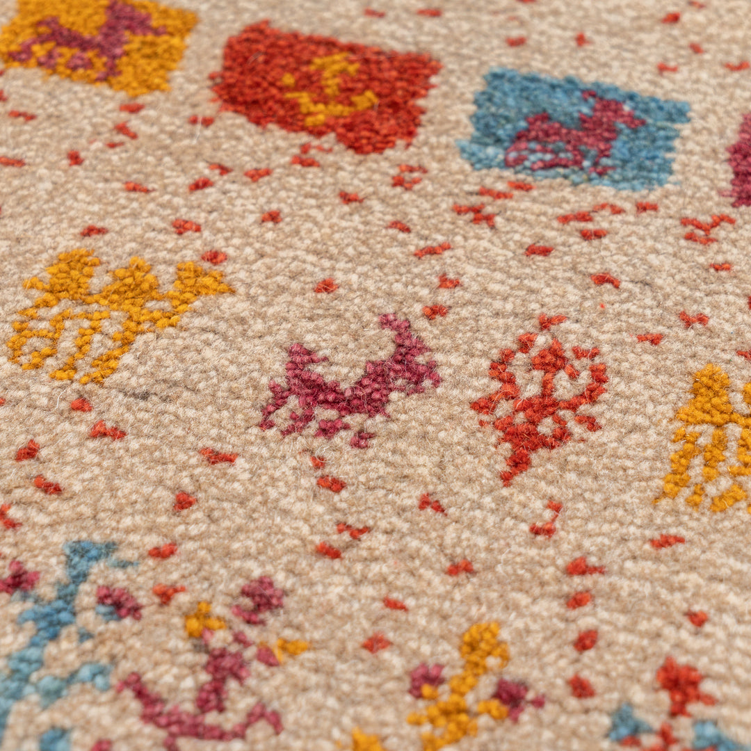 ギャッベはイランのザクロス山脈を遊牧しているカシュガイ族が手織りする、草木染の羊毛を使った毛足の長い生活に根付いた絨毯です。本商品に使用されているペルシャバリアントと呼ばれる羊毛は、過酷な環境であるザクロス山脈で生きていく為の優れた耐久性や、体温調整を上手に行うために多くの脂分を含んだ柔らかく触り心地の良い毛質を揃えています。