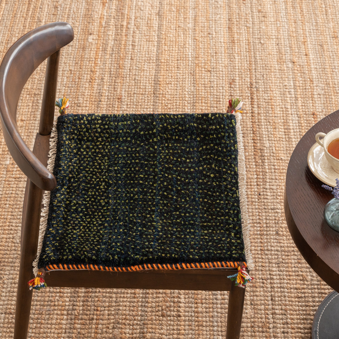 チェアパッドとしてダイニングテーブルの椅子、車の座席、座布団代わりにお使いいただけるペルシャ手織りギャッベ絨毯です。