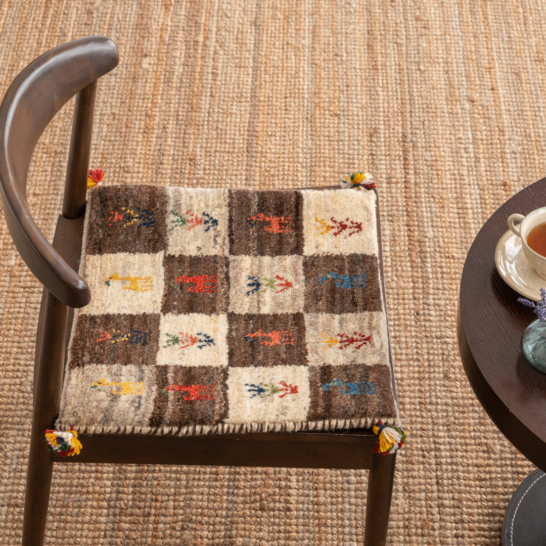 チェアパッドとしてダイニングテーブルの椅子、車の座席、座布団代わりにお使いいただけるペルシャ手織りギャッベ絨毯です。