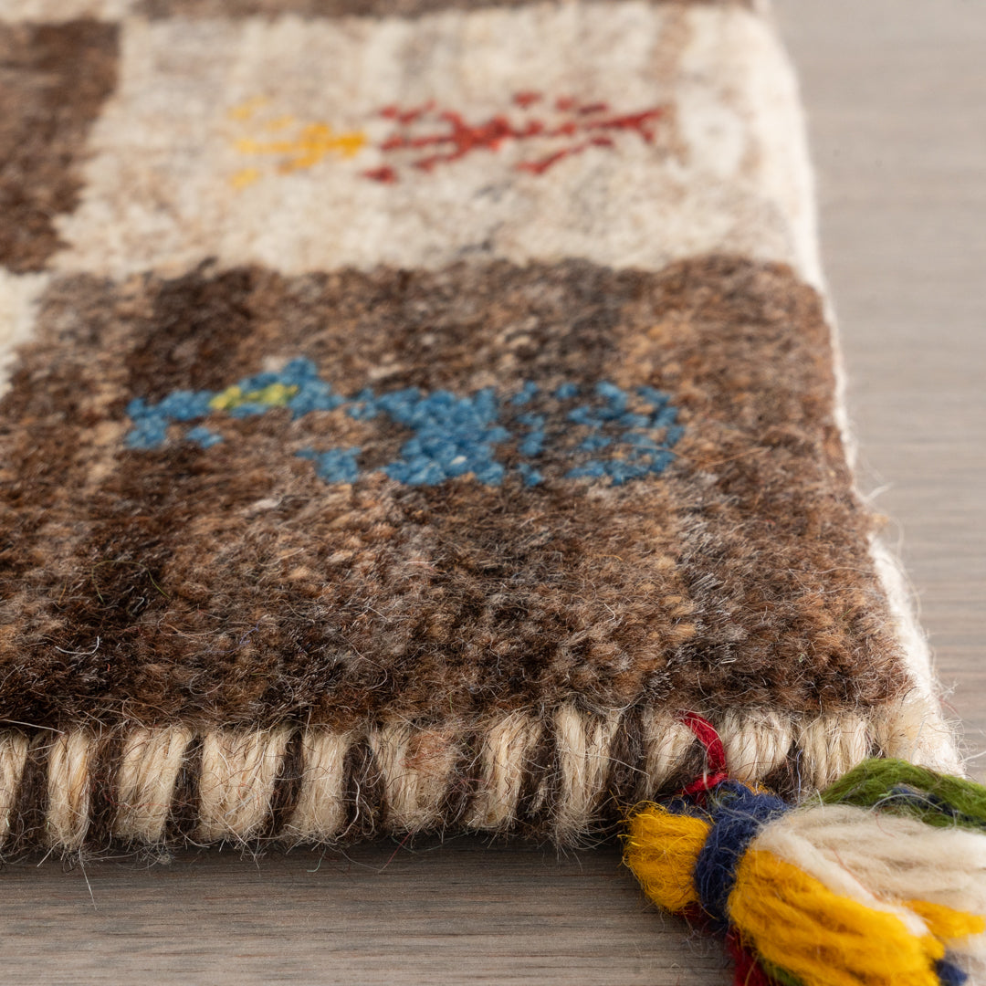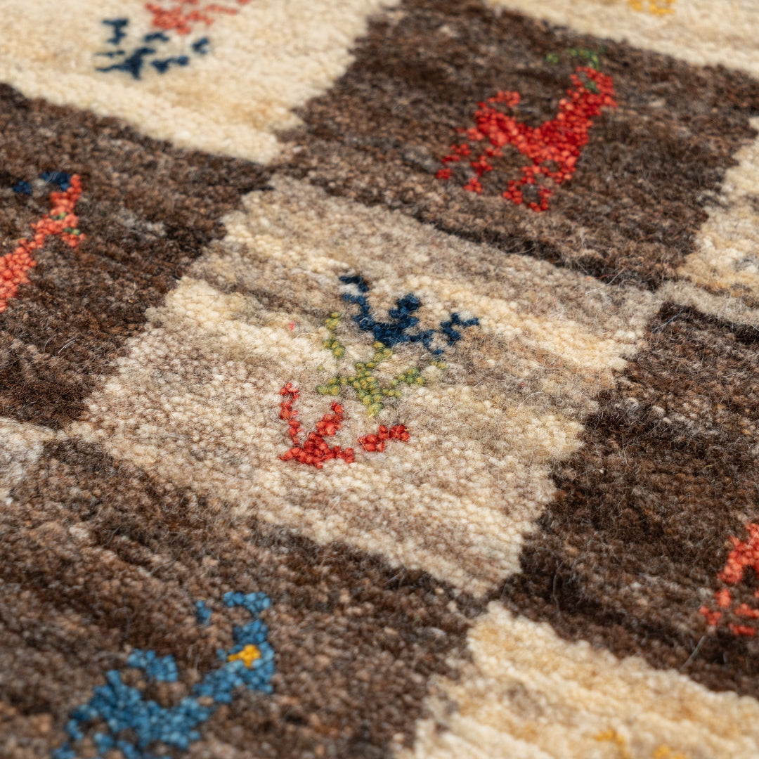 ギャッベはイランのザクロス山脈を遊牧しているカシュガイ族が手織りする、草木染の羊毛を使った毛足の長い生活に根付いた絨毯です。本商品に使用されているペルシャバリアントと呼ばれる羊毛は、過酷な環境であるザクロス山脈で生きていく為の優れた耐久性や、体温調整を上手に行うために多くの脂分を含んだ柔らかく触り心地の良い毛質を揃えています。