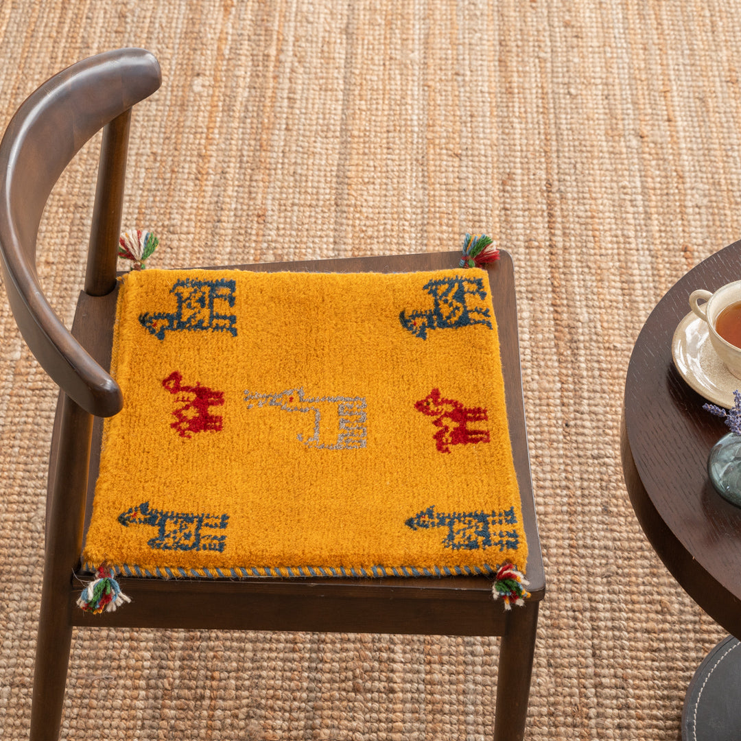 チェアパッドとしてダイニングテーブルの椅子、車の座席、座布団代わりにお使いいただけるペルシャ手織りギャッベ絨毯です。