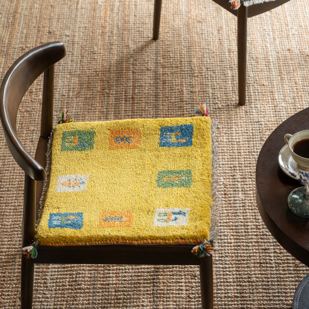 チェアパッドとしてダイニングテーブルの椅子、車の座席、座布団代わりにお使いいただけるペルシャ手織りギャッベ絨毯です。