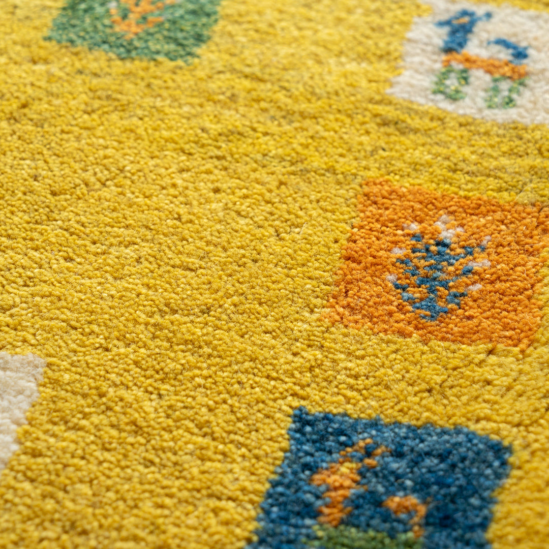 その羊毛を天然染料で染めて、イランの遊牧民が1本1本丁寧に手で織ったギャッベはフカフカで気持ち良い肌ざわりなのが特徴です。