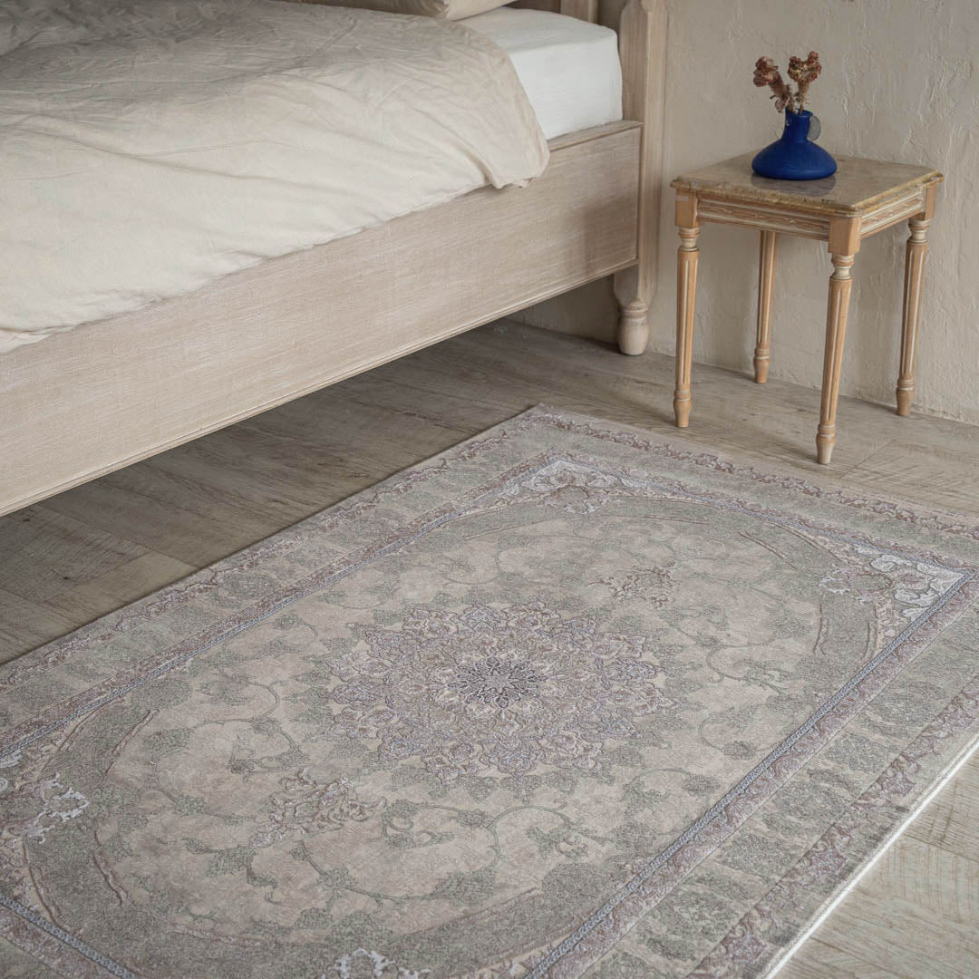 「ディリネ」とはペルシャ語で「古い(ヴィンテージ)」を意味します。この絨毯は独特の光沢感を絨毯の柄に活かしたデザインとなっており、絨毯に面白みを加えています。特殊な技術により、花の模様が浮き上がり、立体感を演出しています。メダリオン柄がペルシャ絨毯らしいクラシックデザインを際立たせ、ヴィンテージ調の色合いがお部屋に落ち着きと上品さをもたらします。
