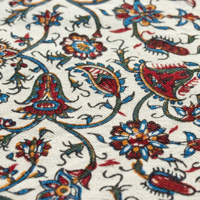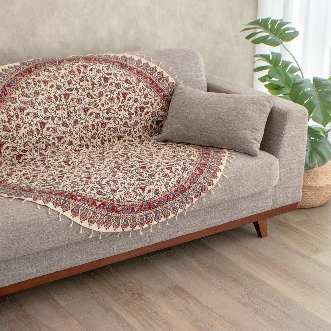 イランの古都イスファハン産の綿100%の木綿の布に、模様を彫り込んだ木製のはんこに天然染料をつけてスタンプを捺すように一つ一つ絵付けしています。シワになりにくく、適度に厚みもあるので、テーブルクロスだけでなく、ベッドやソファー・こたつ等のマルチカバーやタペストリーなど、アイデア次第で魅力的なインテリアになります。ご自宅で水洗いも可能です。